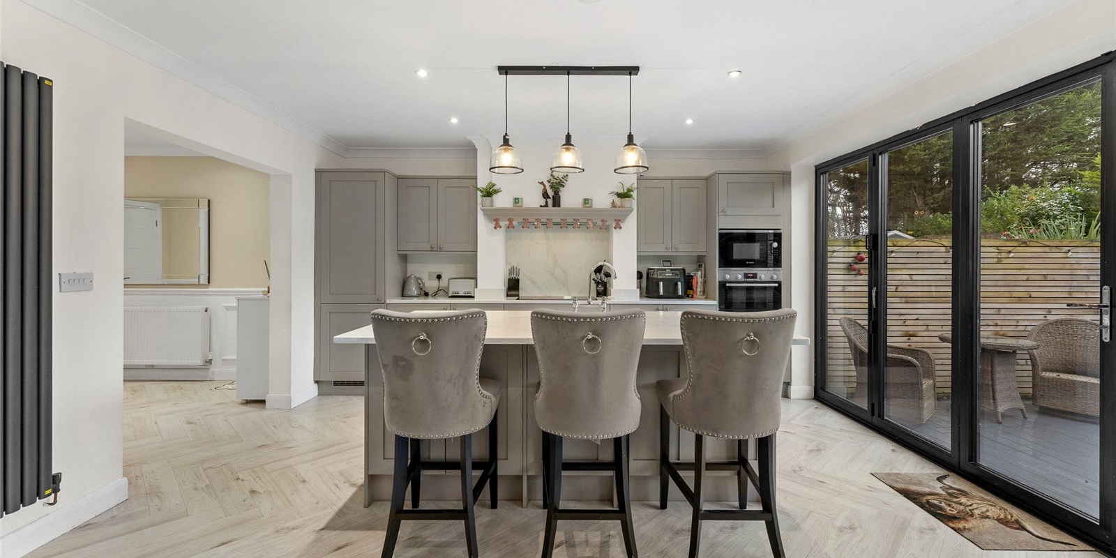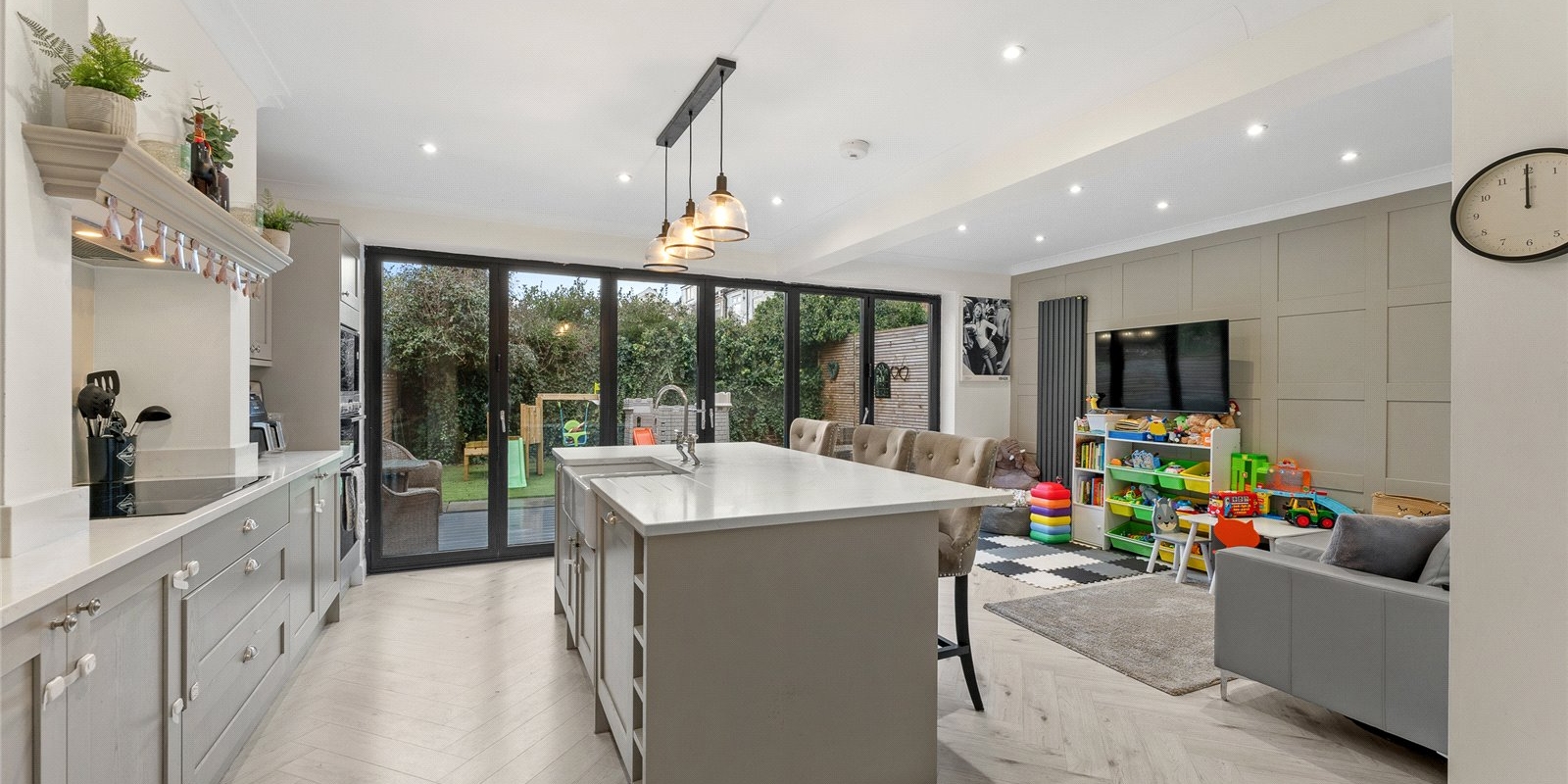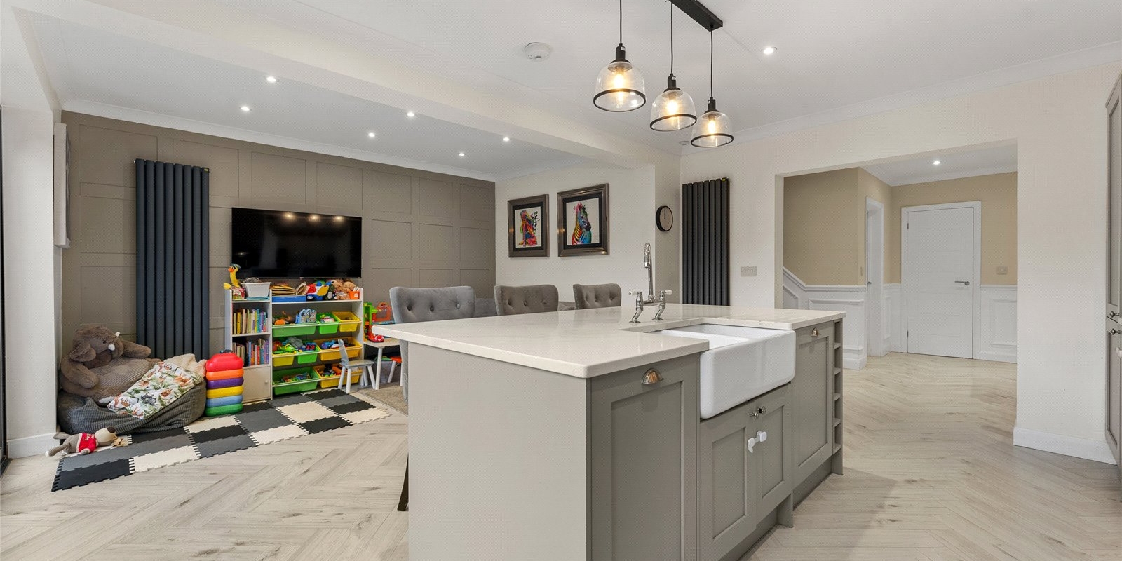 To the rear of the property is the standout open-plan kitchen, dining and family room, thoughtfully designed for modern family life and entertaining. The bespoke kitchen is fitted with sleek cabinetry, quality integrated appliances and a generous central island, complemented by elegant pendant lighting and herringbone-style flooring. The space flows seamlessly into a family and dining area, flooded with natural light via full-width bi-fold doors opening directly onto the landscaped rear garden, ideal for both indoor and outdoor entertaining.