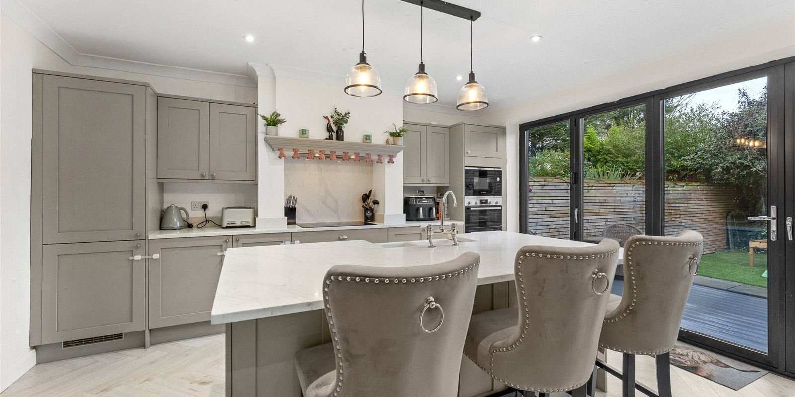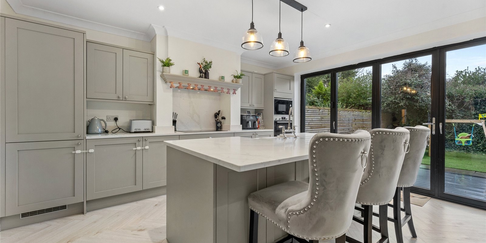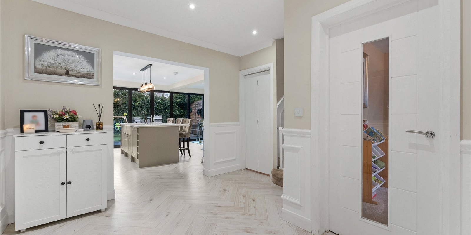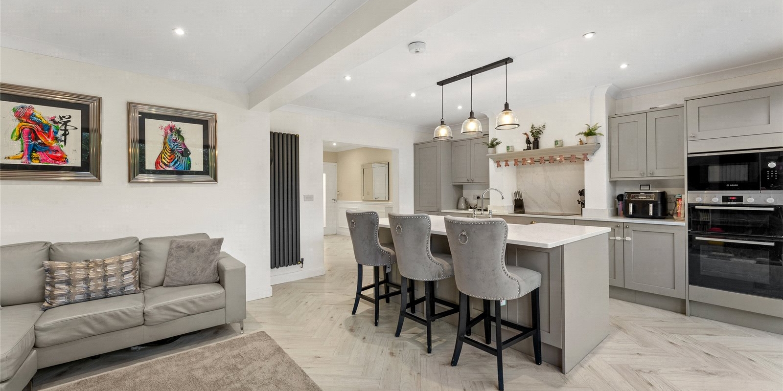 To the rear of the property is the standout open-plan kitchen, dining and family room, thoughtfully designed for modern family life and entertaining. The bespoke kitchen is fitted with sleek cabinetry, quality integrated appliances and a generous central island, complemented by elegant pendant lighting and herringbone-style flooring. The space flows seamlessly into a family and dining area, flooded with natural light via full-width bi-fold doors opening directly onto the landscaped rear garden, ideal for both indoor and outdoor entertaining.