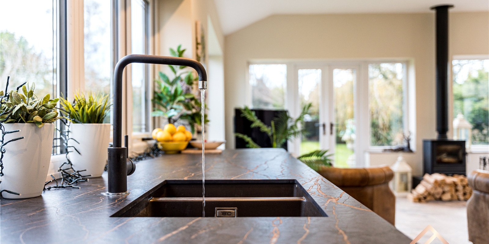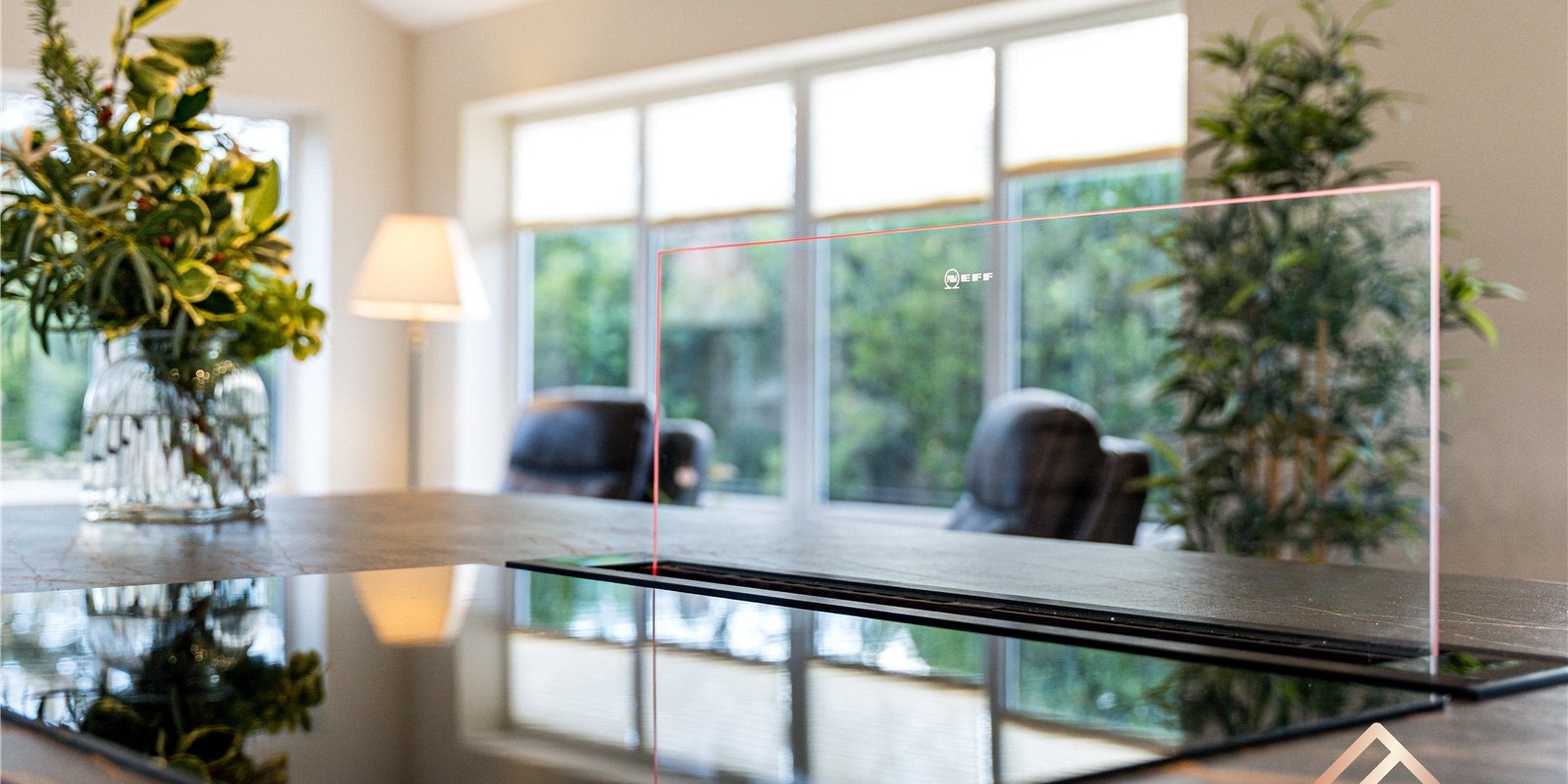 At the heart of the home is the stunning extended kitchen, finished to an exceptional standard with sleek modern cabinetry, premium built-in appliances, and high-quality fittings throughout. The kitchen is tiered, creating a natural separation between cooking and dining areas, with ample space for a dining table. A striking feature is the innovative extractor that rises seamlessly from the worktop, enhancing the clean, modern aesthetic.
