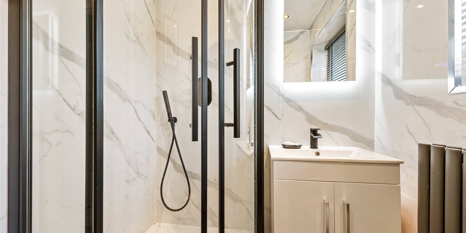 The accommodation includes two well-proportioned bedrooms, both finished in neutral tones to suit a range of furnishings and décor styles. The modern bathroom has been thoughtfully designed and features a contemporary walk-in shower with high-quality fittings.