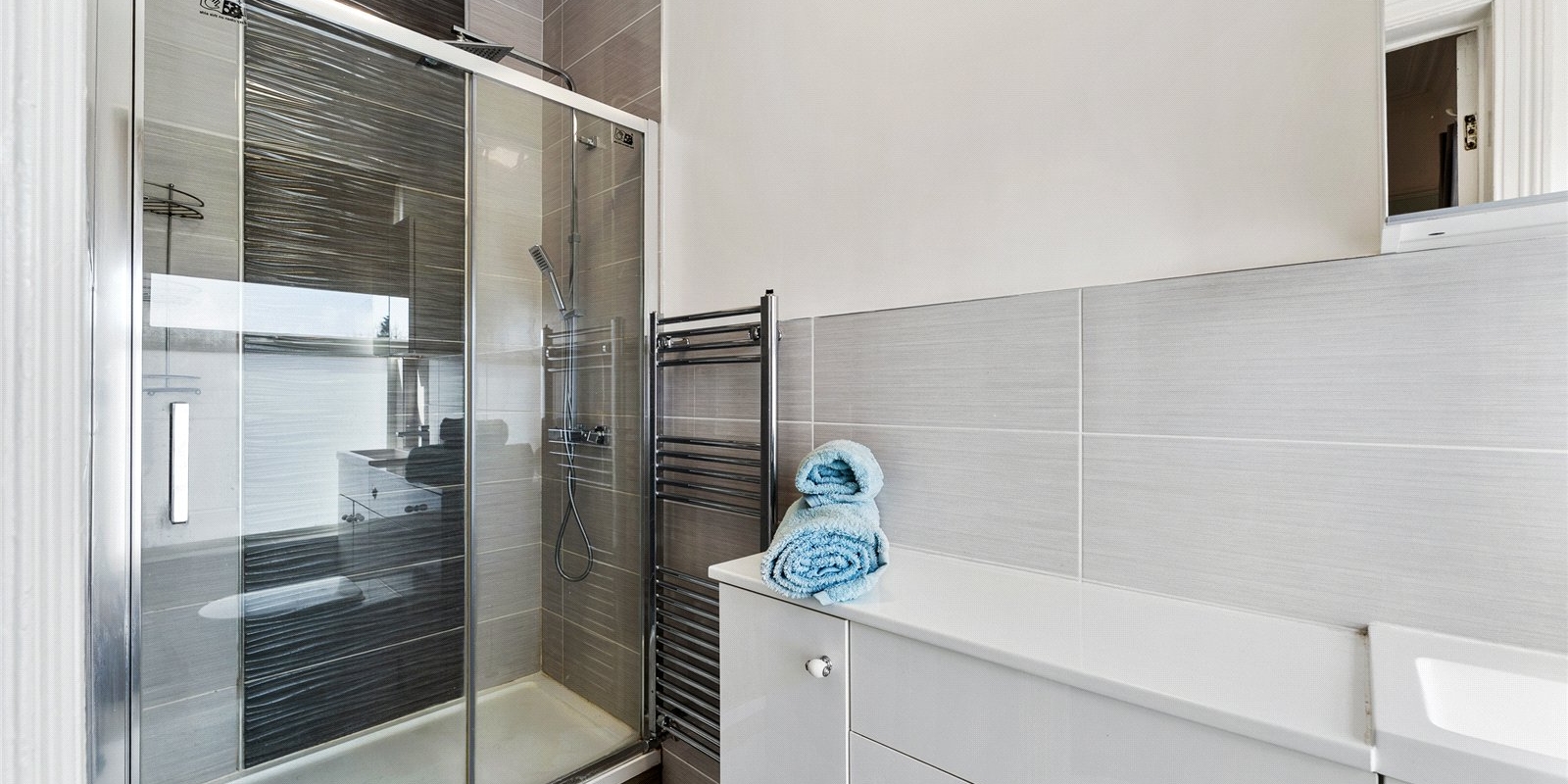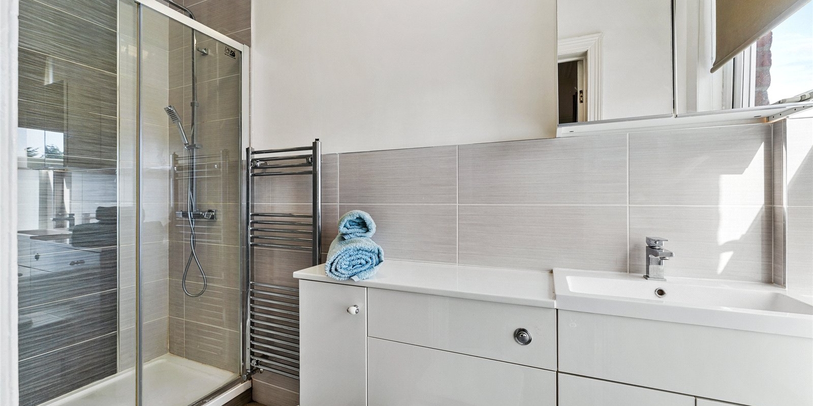 The first floor accommodates four well-proportioned double bedrooms, all benefiting from excellent natural light. The principal bedroom is particularly impressive, featuring a stylish modern en-suite shower room. The remaining bedrooms are served by a contemporary family bathroom, complete with a bath and overhead shower.
