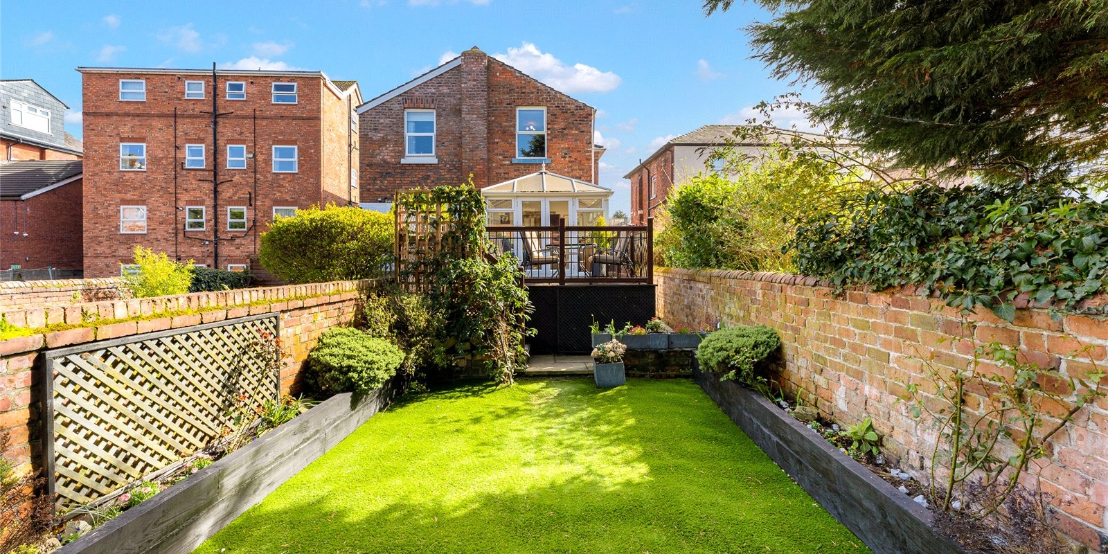 To the rear, a bright and airy conservatory creates an additional reception space, enjoying a sunny aspect and pleasant views over the garden. This leads directly onto a raised terrace—perfect for outdoor dining—while steps descend to a beautifully maintained, private garden, offering a peaceful retreat with a high degree of seclusion. A useful side access adds further practicality.