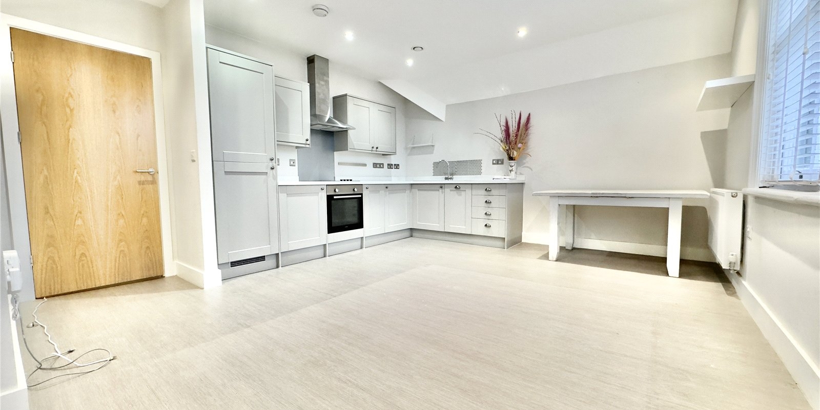 Upon entering the apartment, you are greeted by a generous hallway that creates an immediate sense of space and provides access to each room. The heart of the home is the impressive open plan kitchen, living and dining area — a bright, versatile space designed for modern living. The layout allows for comfortable seating, dining and entertaining zones, while the large window enhances the room with natural light and a pleasant open aspect. The kitchen is fitted with contemporary units and integrated appliances, offering both style and practicality.