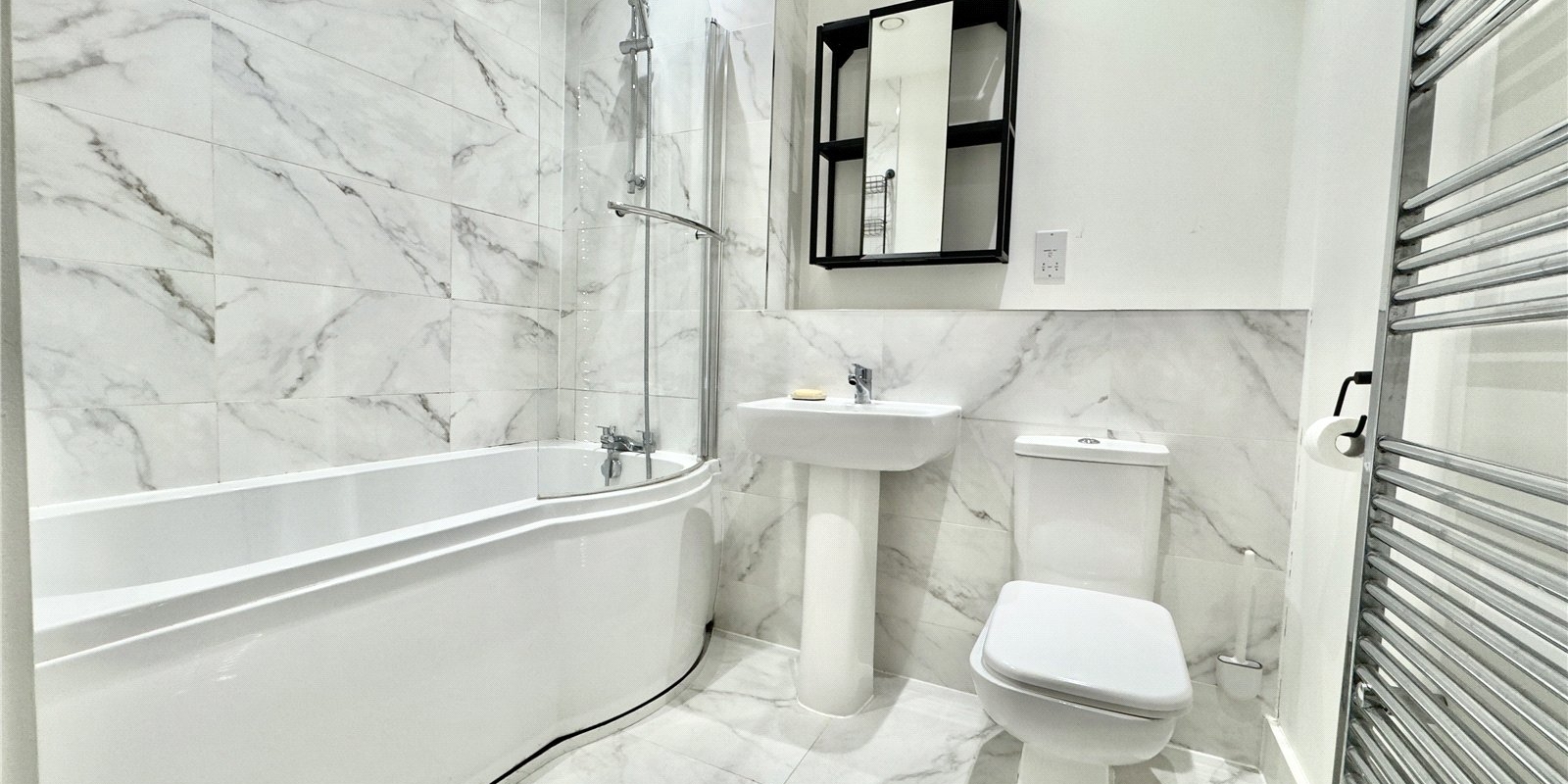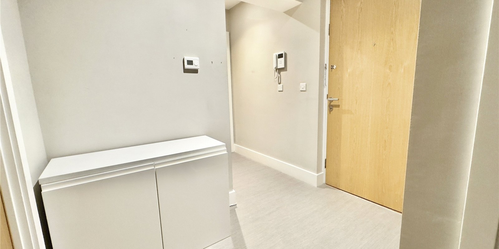 Both bedrooms are well proportioned, with the principal bedroom offering a particularly spacious footprint. The second bedroom is equally versatile and can function as a guest room, home office or nursery, depending on the buyer’s needs. A modern bathroom sits off the hallway, finished in a clean, neutral style that will appeal to a wide range of tastes.