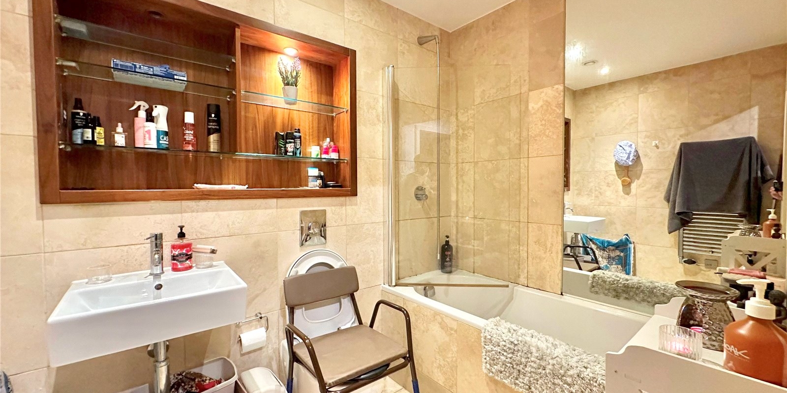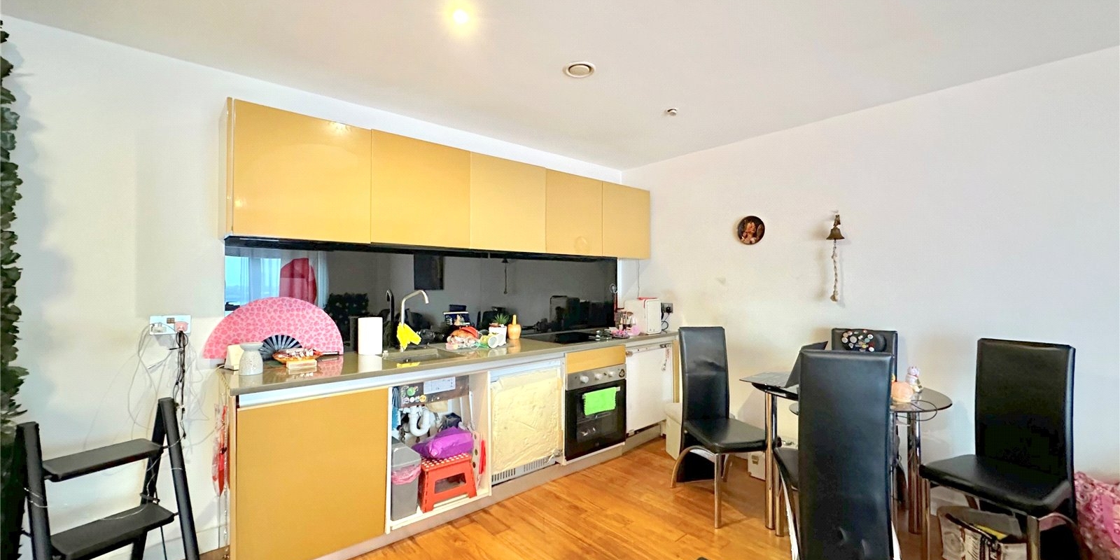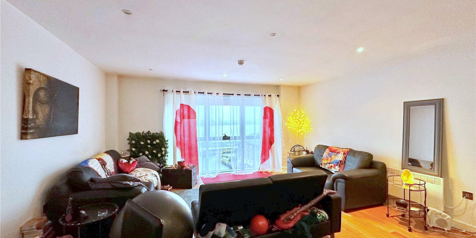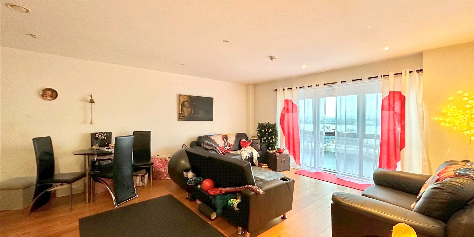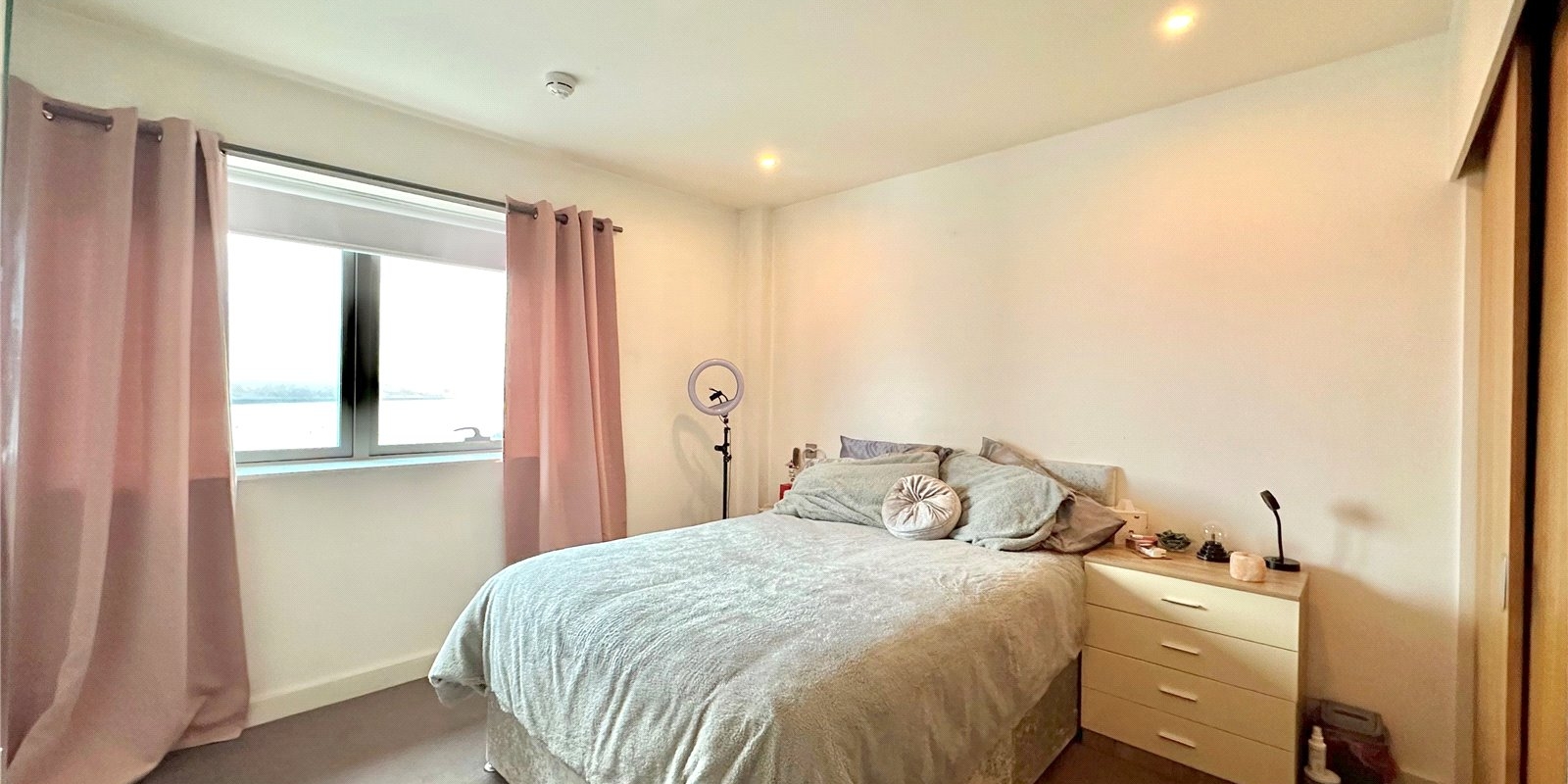 The apartment boasts a generous double bedroom with fitted wardrobes, providing ample storage, and a sleek three-piece family bathroom. Large windows allow for plenty of natural light and showcase the picturesque waterfront views.