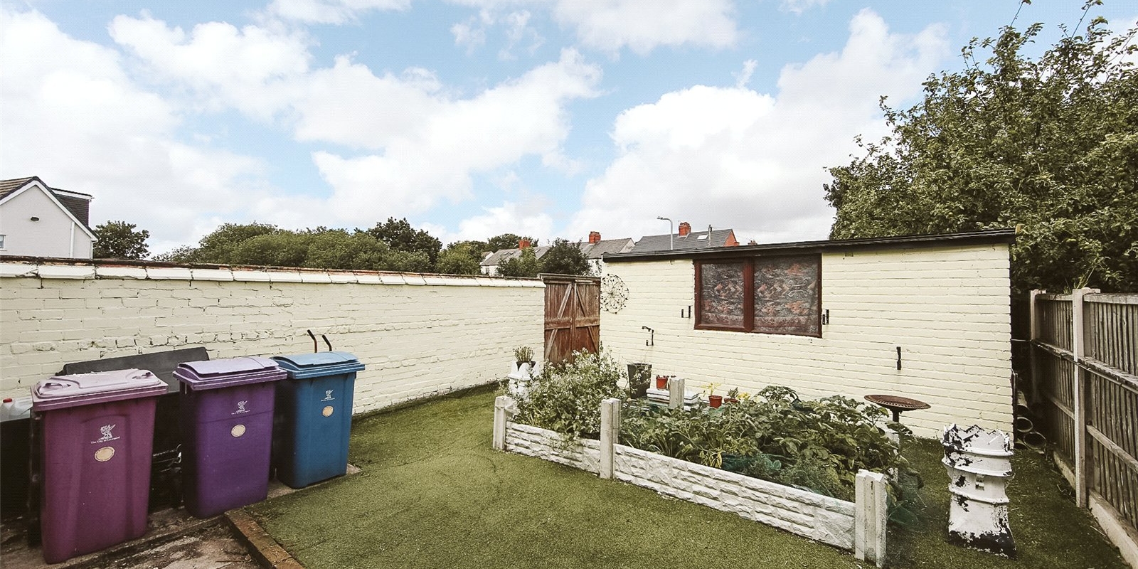 To the rear, the property boasts a private and secure garden—a great space for outdoor dining, relaxing, or letting children play safely. It also features a detached garage-style outbuilding, perfect for additional storage, use as a workshop, or even a hobby space.