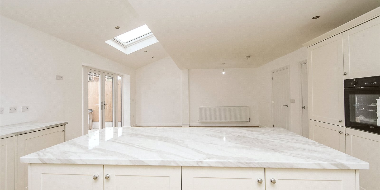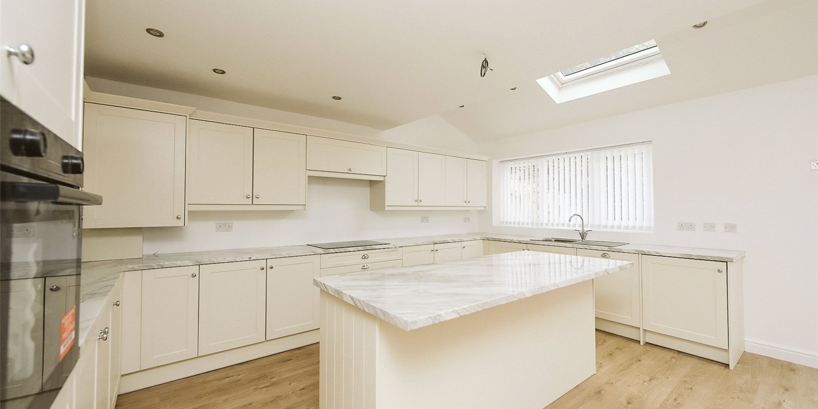 Located in a sought-after residential area, the property features a private driveway and a welcoming entrance into a bright and airy interior. The heart of the home is the open-plan kitchen, dining, and living area, complete with Velux windows for added natural light.