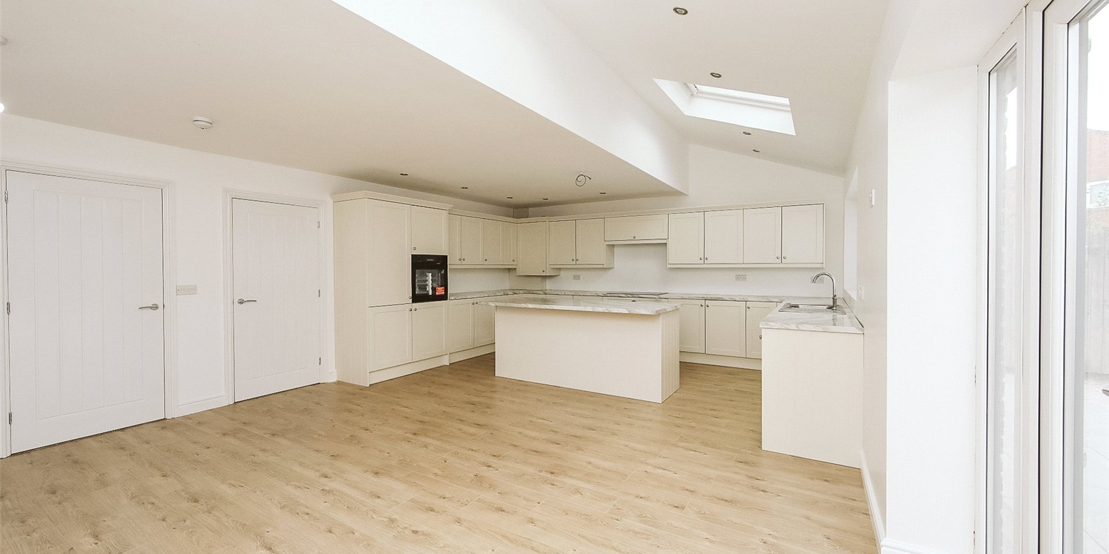 Step inside to a bright and welcoming entrance hall that sets the tone for the rest of the home. At its heart lies a stunning open-plan kitchen, dining, and living area — flooded with natural light thanks to Velux skylights and large windows. The contemporary kitchen features sleek, neutral-toned cabinetry, a central island, and fully integrated appliances, offering a stylish and functional space for everyday living and entertaining.