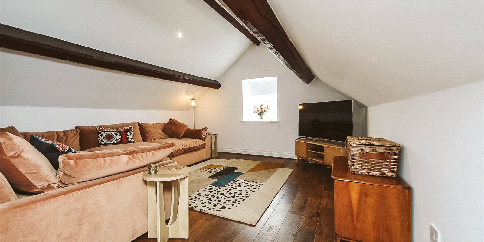The upper level boasts a uniquely versatile second bedroom featuring beautiful original beams, vaulted ceilings, and stylish wooden flooring. Currently used as an additional lounge area, this room can serve equally well as a guest room, home office, or bedroom—tailored to suit your lifestyle.
