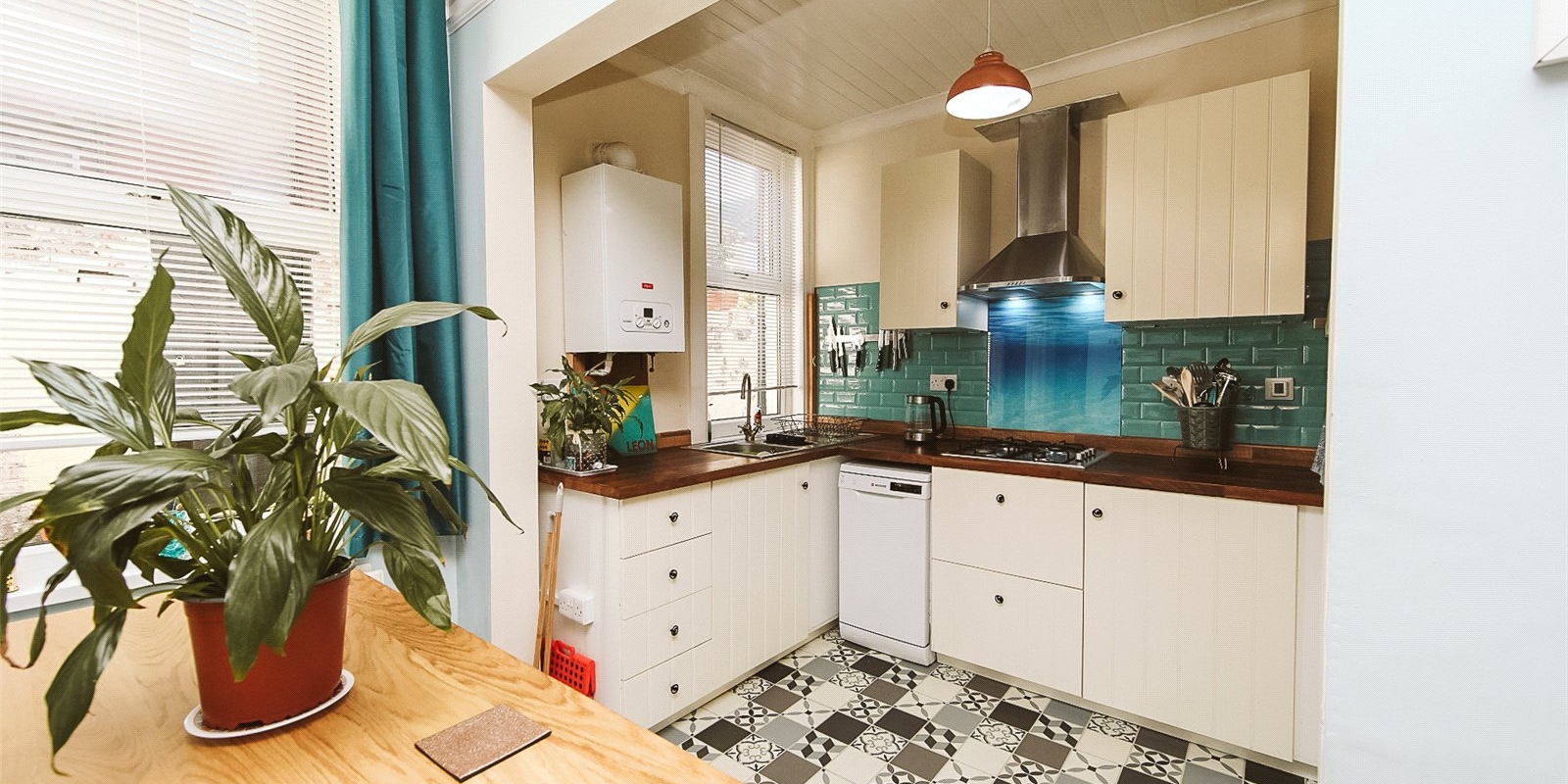 The modern kitchen features ample worktop and cupboard space, integrated appliances, and underfloor heating. A connecting door from the dining room leads to a small utility area.