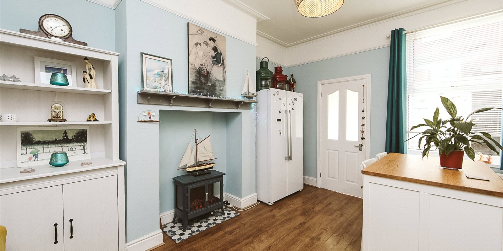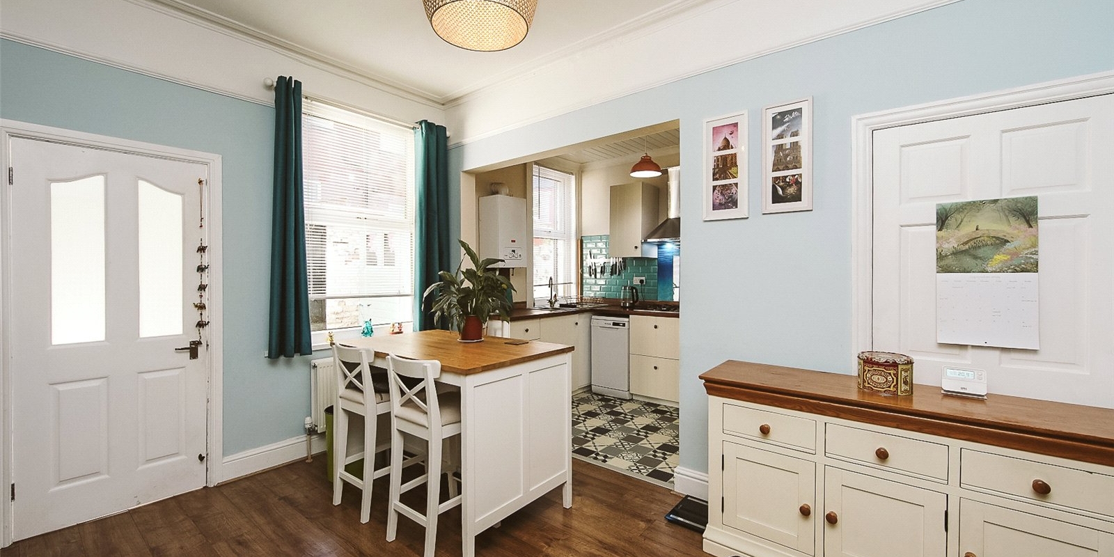 A connecting door from the dining room leads to a small utility area and separate downstairs WC which adds convenience for guests and busy family life. The back door leads from this area into a spacious back yard which includes a 2m x 1m wooden shed