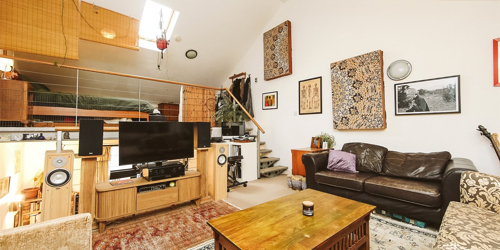 The second bedroom is a mezzanine set within the top of the block, looking over a large multi-functional reception room. The kitchen has plenty of storage and space for food preparation. The primary living room opens out onto a balcony space, perfect for enjoying a coffee in the mornings.