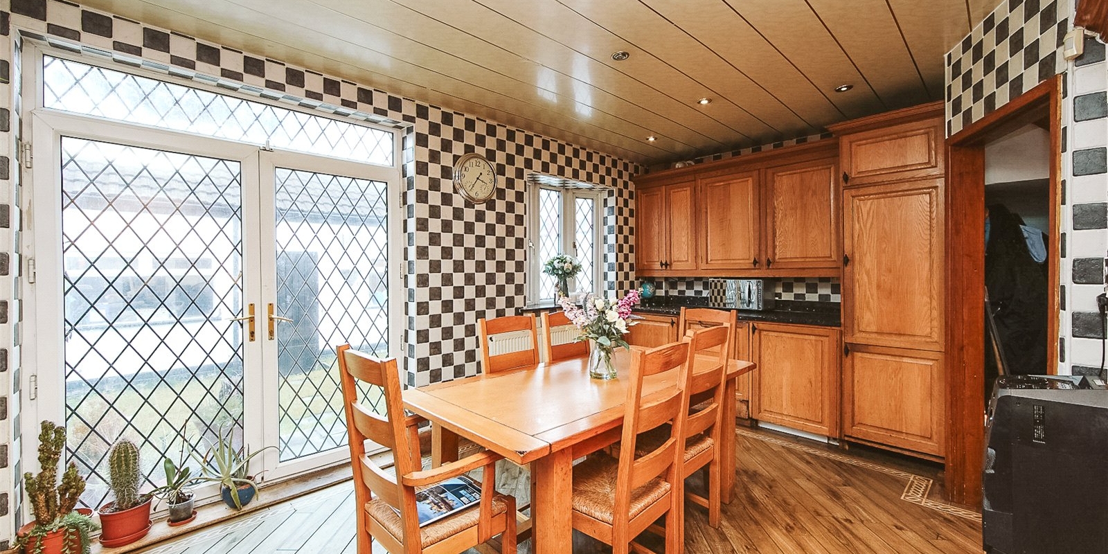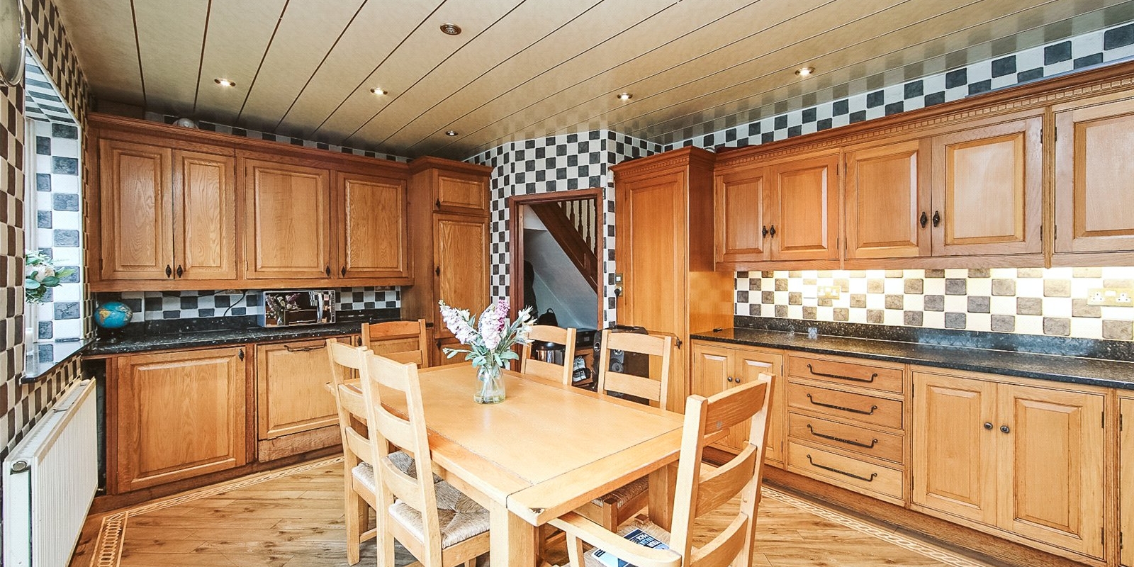 The house offers a bright and open space throughout, as you enter into a large hallway leading off into the primary reception room at the front of the house. The kitchen is beautifully finished with natural wood, with space for a full dining table and chairs at the centre.