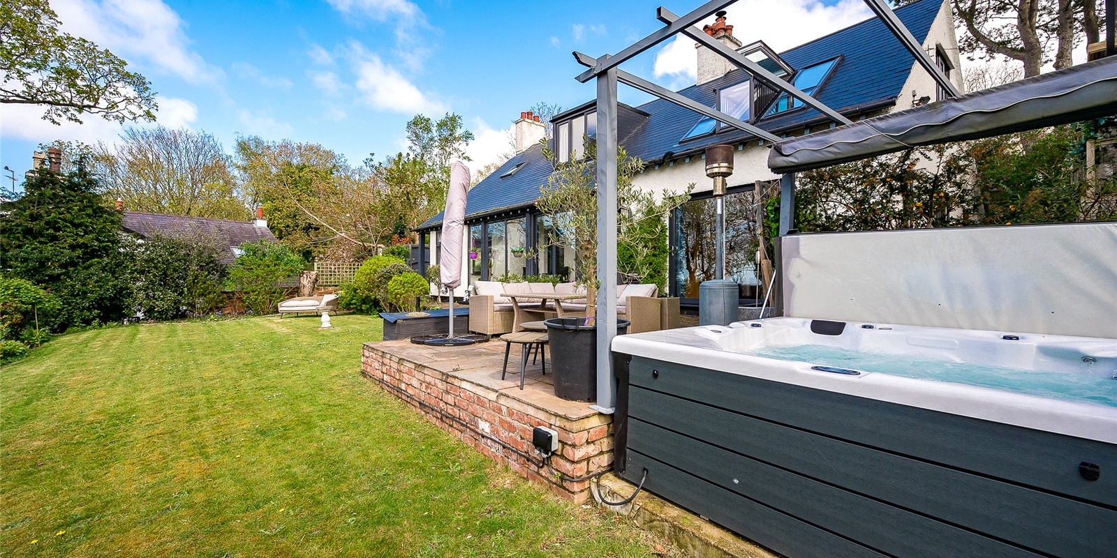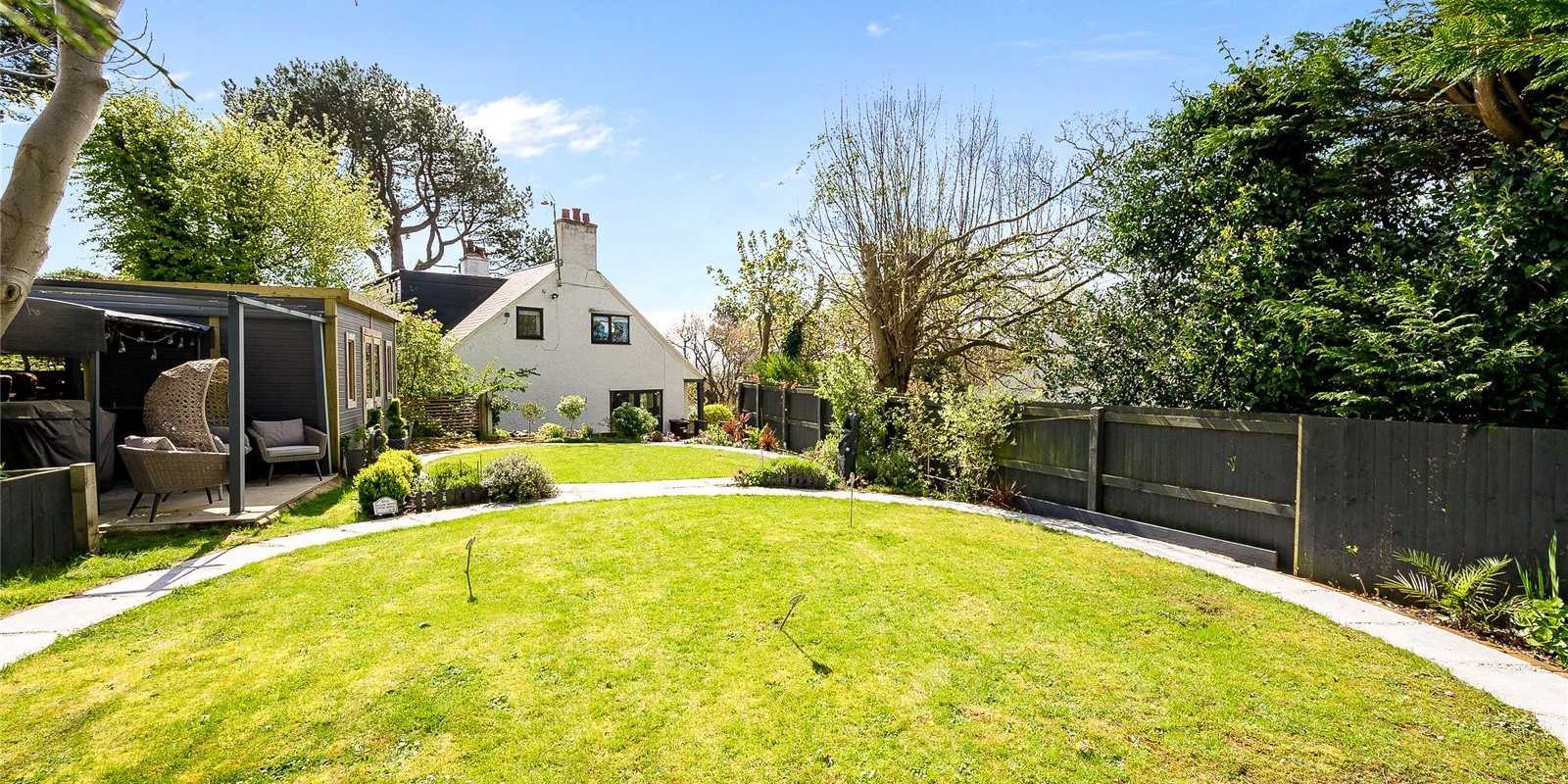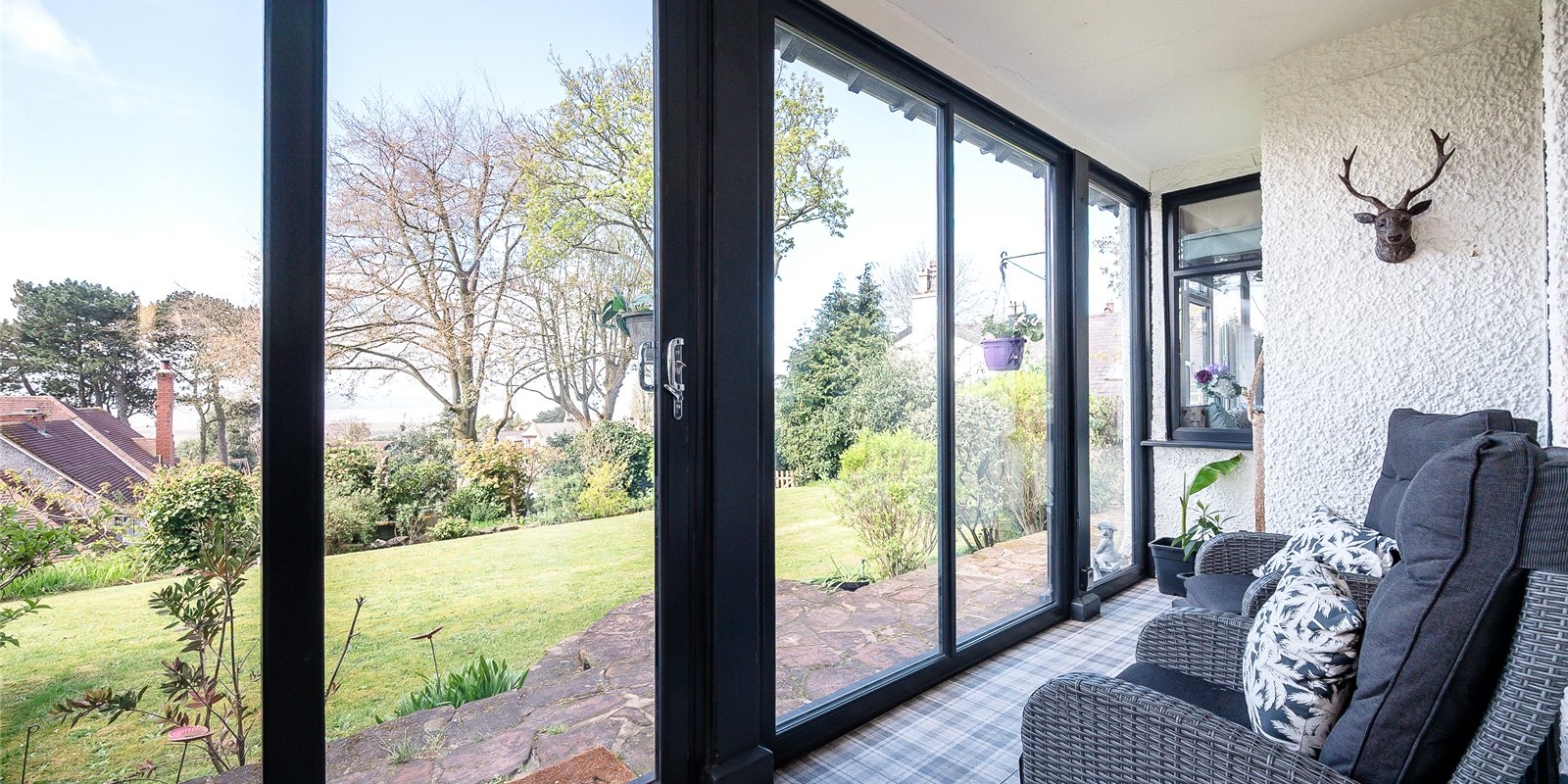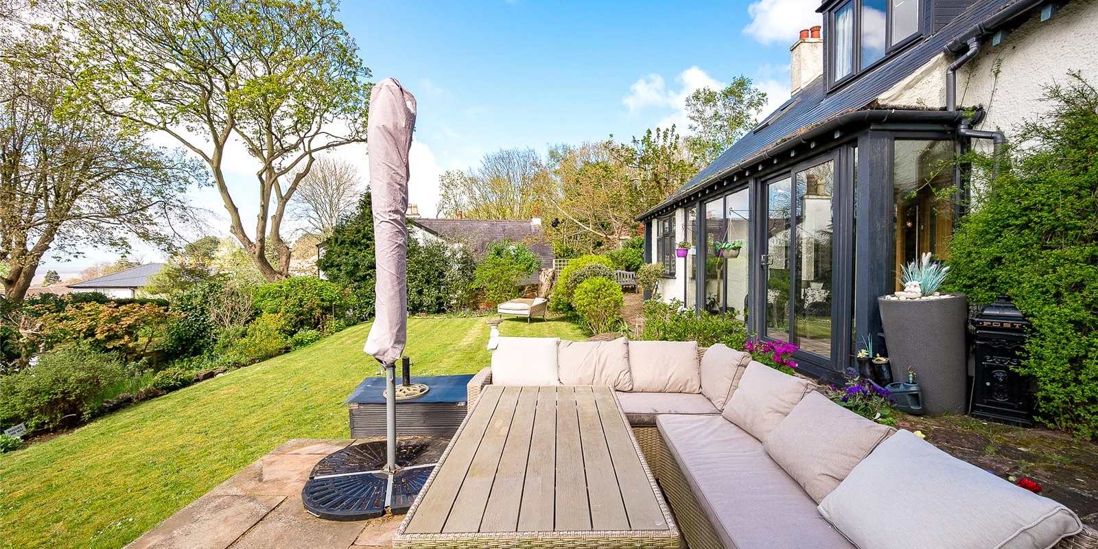 The substantial garden wraps around the house. A large patio area provides a delightful space for garden furniture when enjoying the sun and views. Well-maintained shrubs border the garden and provide privacy to the garden.