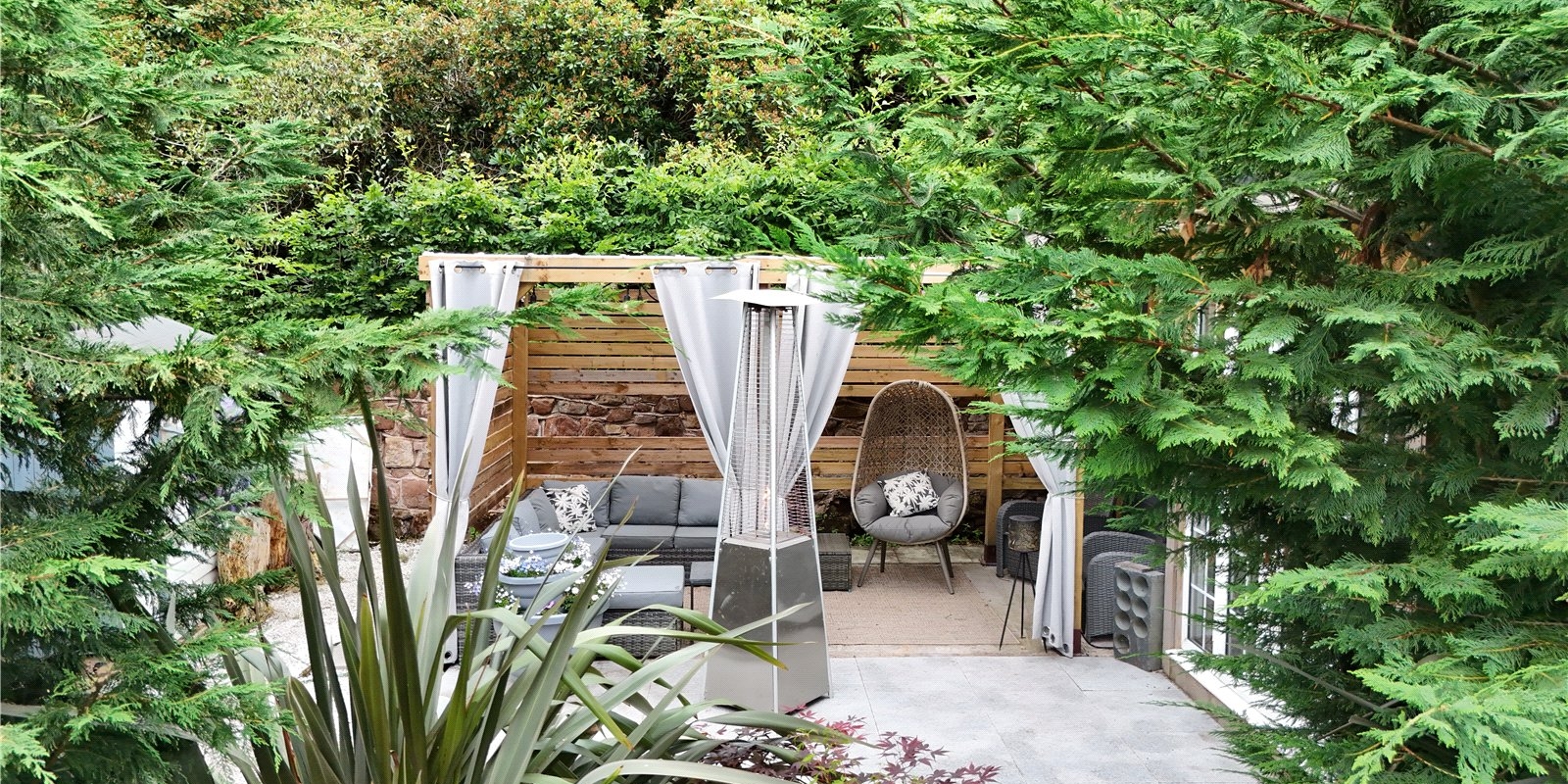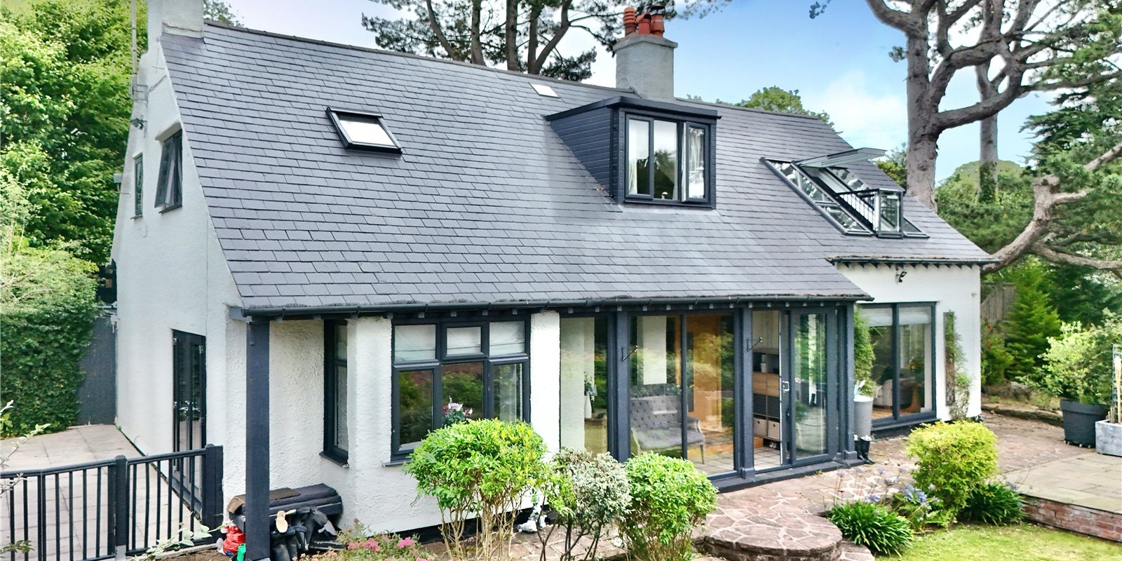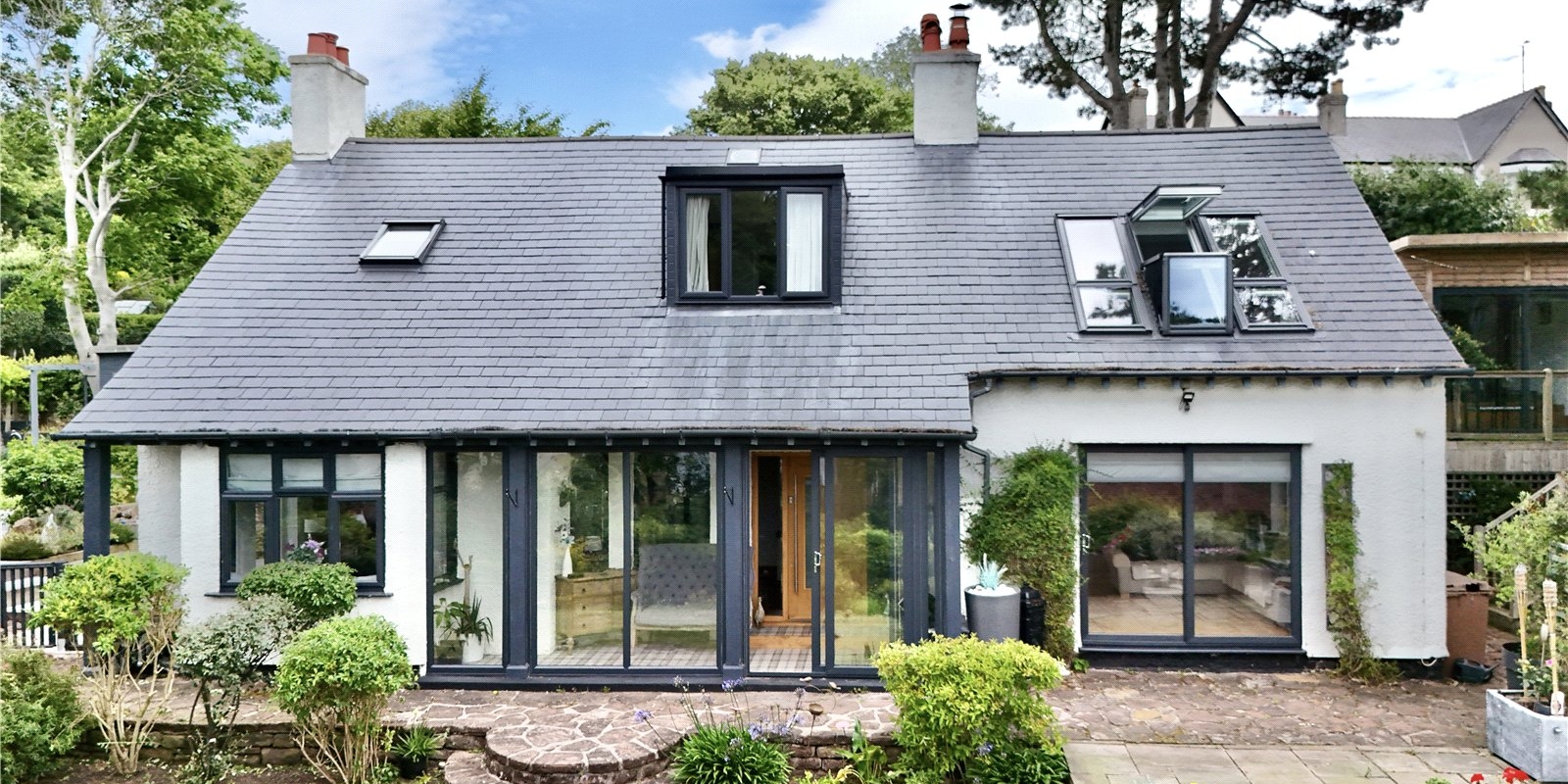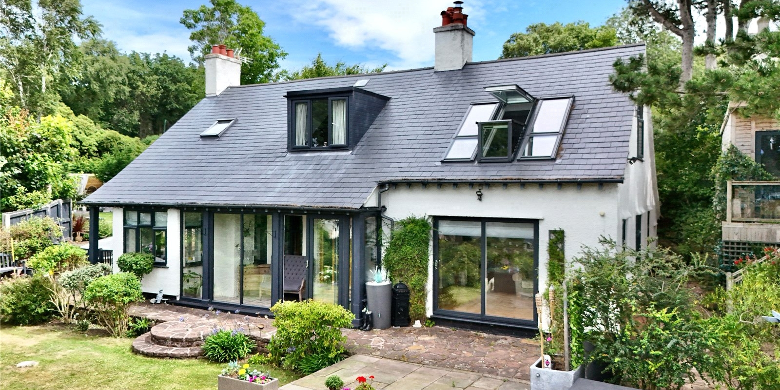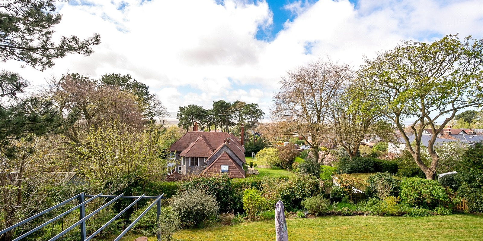 The substantial garden wraps around the house. A large patio area provides a delightful space for garden furniture when enjoying the sun and views. Well-maintained shrubs border the garden and provide privacy to the garden.