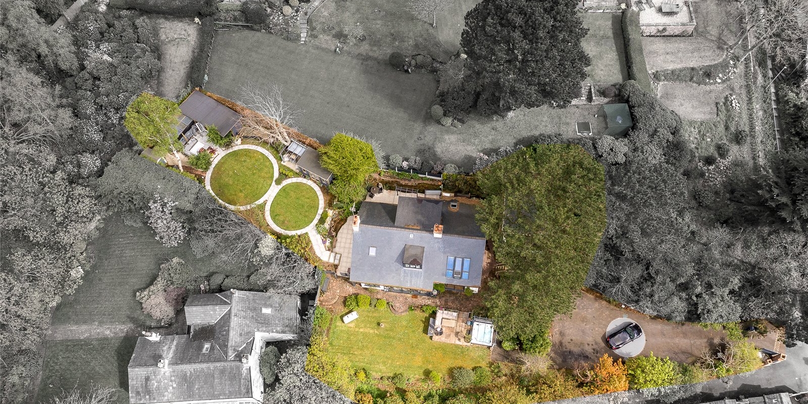 The property and surrounding land has been extensively modernised in recent years with the addition of gas central heating, new roof, beautifully landscaped gardens, extensive driveway with turntable, stunning treehouse office, two separate outbuildings with one benefiting from a kitchen and shower room.
