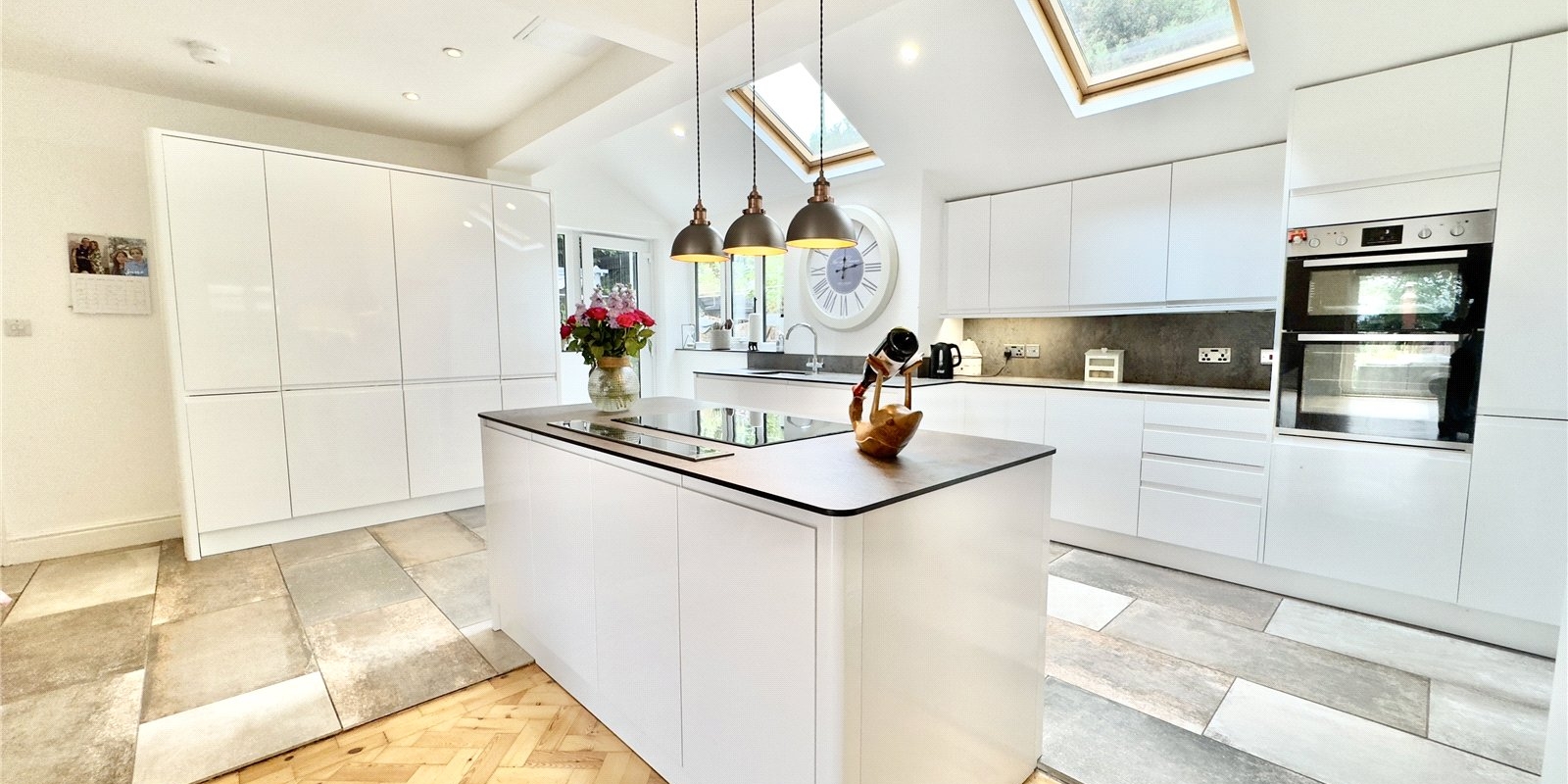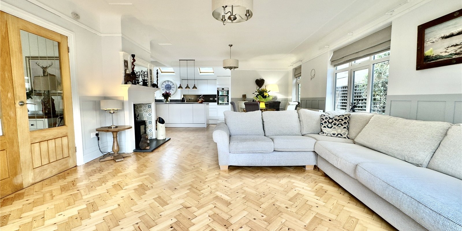 Internally the property comprises of a beautiful hallway with parquet flooring and a large open plan kitchen diner with a lounge are which features a log burner - The perfect place to entertain friends and family. The kitchen area has an abundance of gloss handleless cabinetry, high end worktops, a centre island and quality integrated appliances. Also to the ground floor is a spacious lounge, utility room, study which can be used as a bedroom and a quality shower room which is fitted with a contemporary three-piece suite.