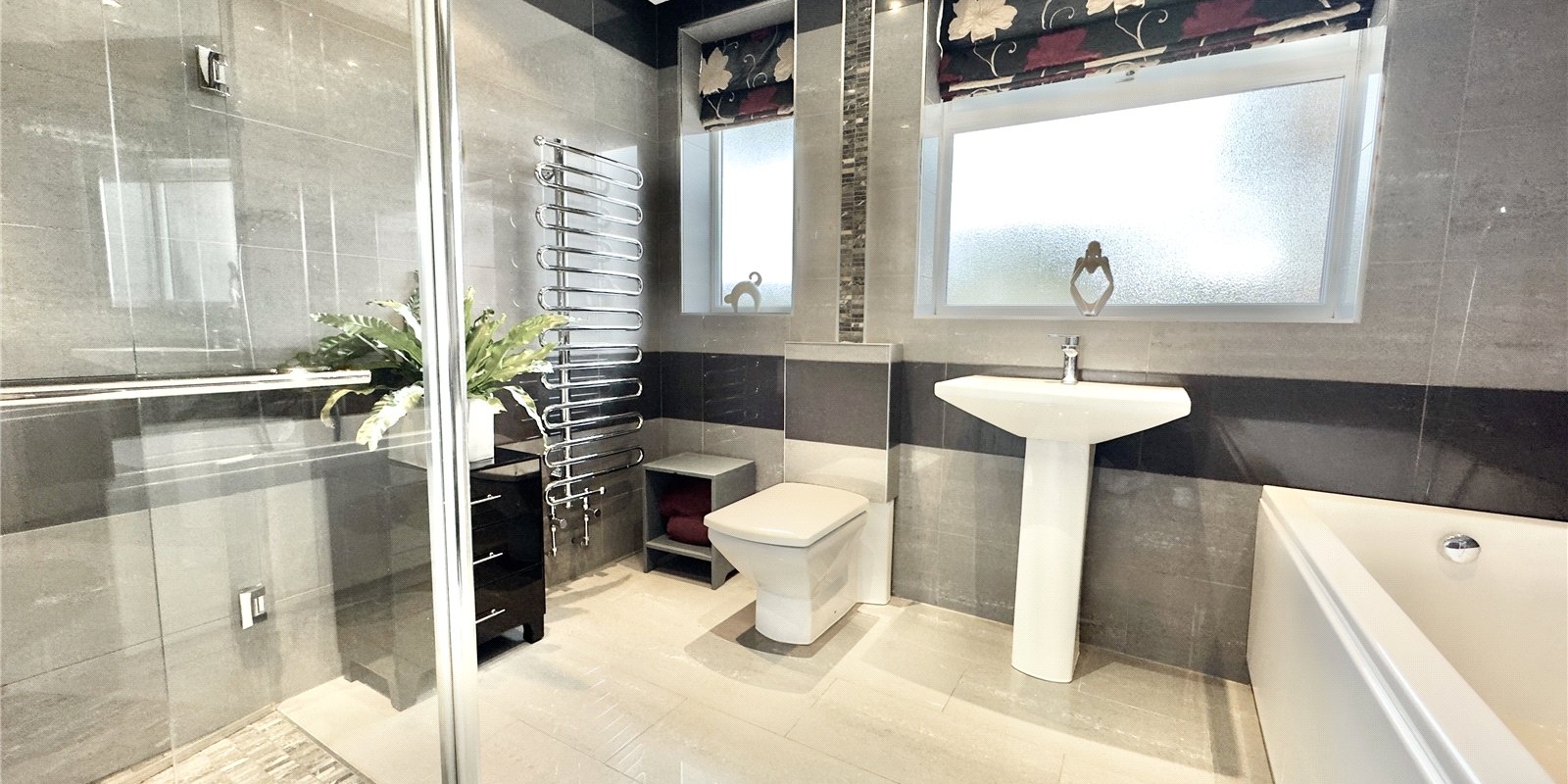 To the rear of the property there are three well-proportioned bedrooms. The master bedroom benefits from built-in wardrobes and doors opening out onto a private decked seating area. These bedrooms are served by a beautifully appointed four-piece family bathroom.
