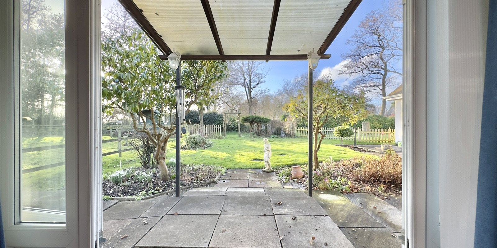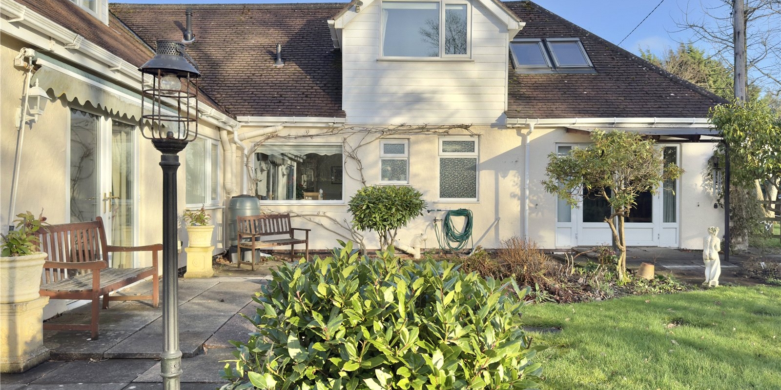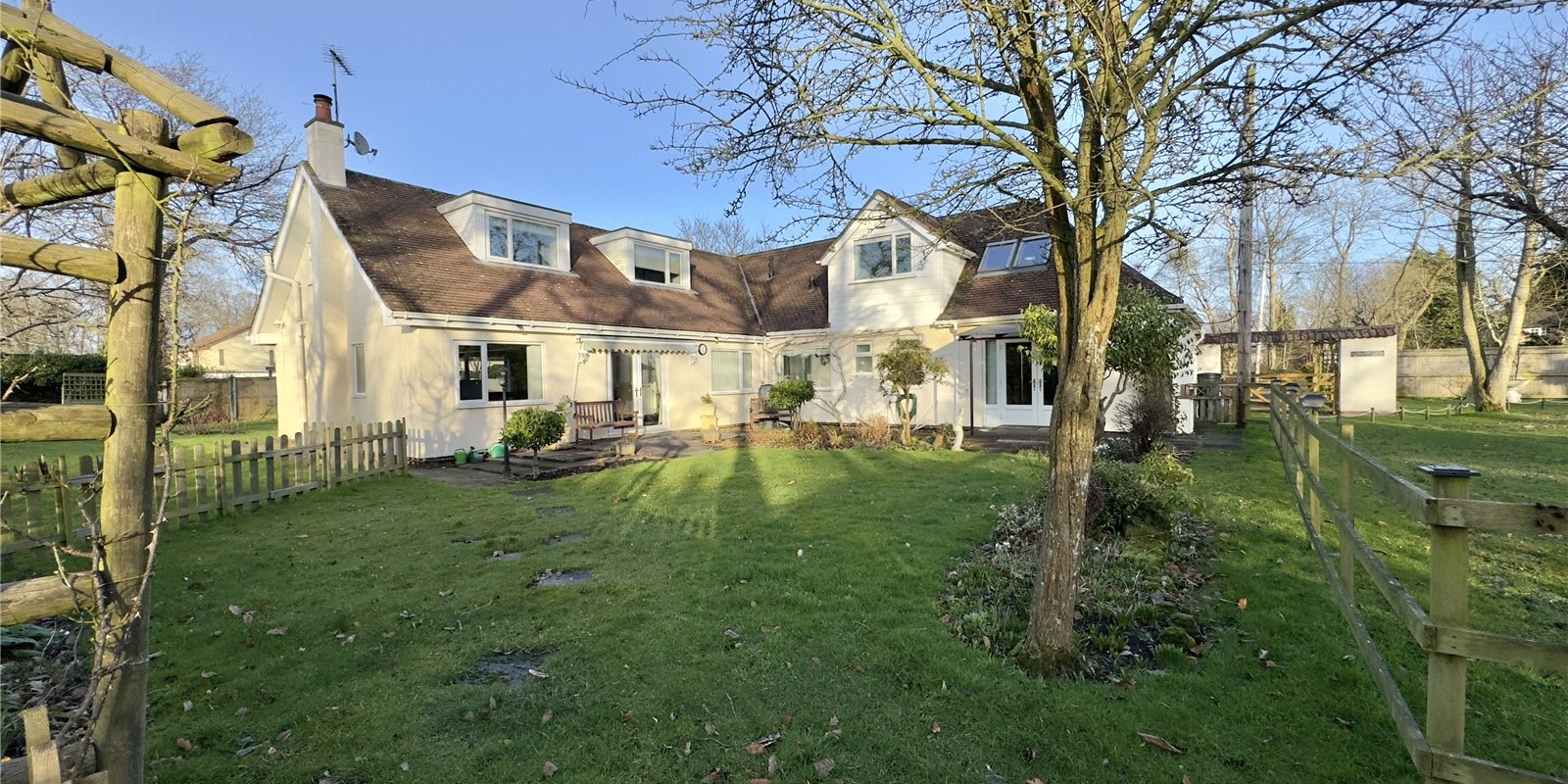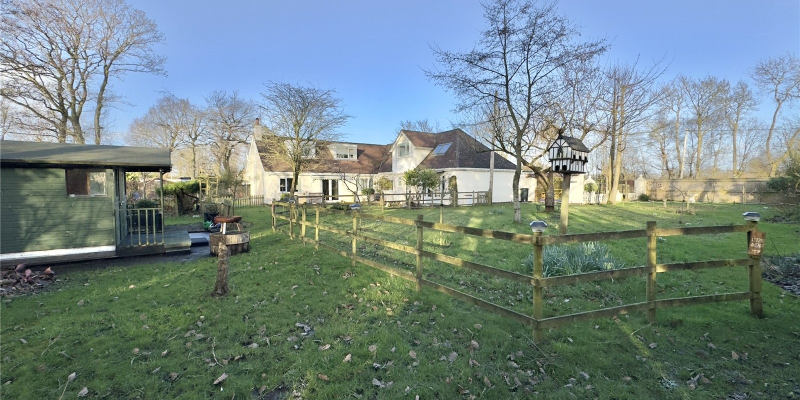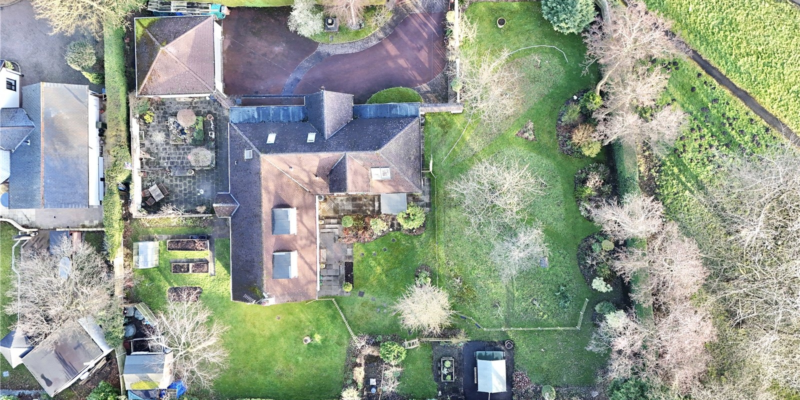 The property sits on approximately 0.5 acres of land, offering plenty of outdoor space. The grounds are mostly laid to lawn, complemented by a charming meadow, patio area, and a selection of outbuildings. There’s also ample parking to the front of the property, leading to a detached double garage.