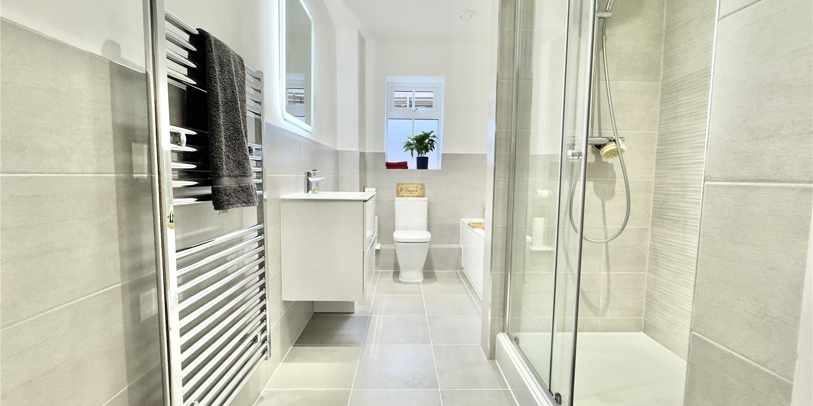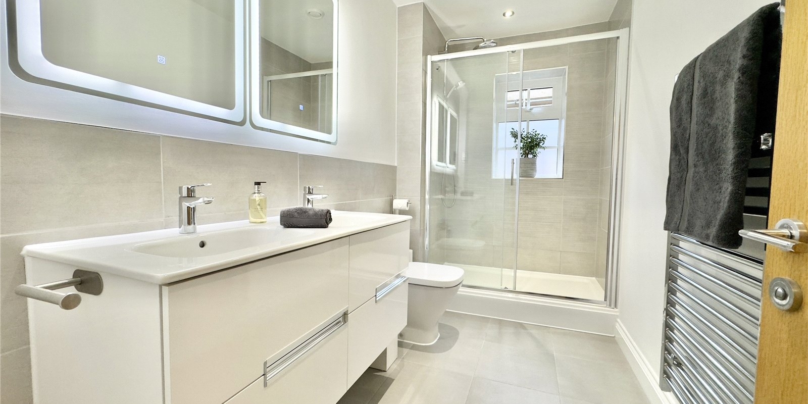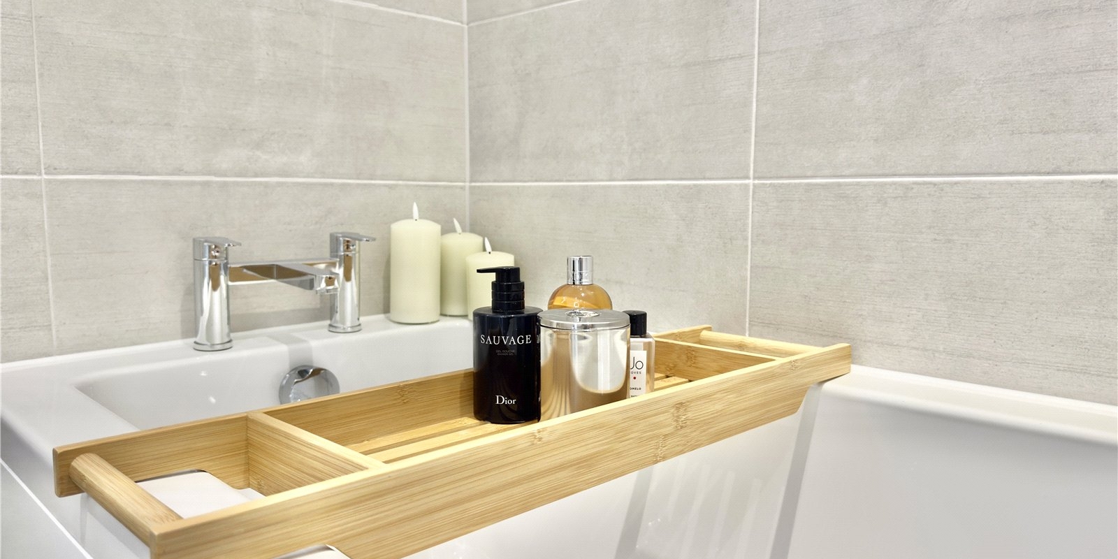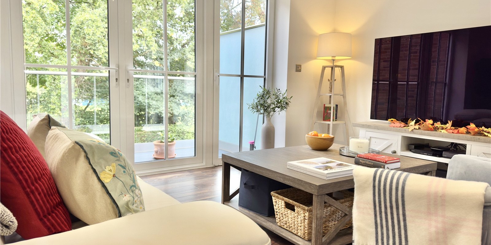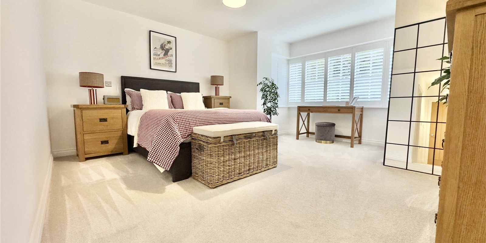 The master bedroom is generously sized and benefits from a stylish en-suite bathroom and a charming bay window fitted with bespoke Hillarys shutters. Two additional bedrooms offer versatility and are currently used as a dressing room and a home office, making the apartment ideal for professionals or those who work from home. A modern four-piece main bathroom complements the layout.