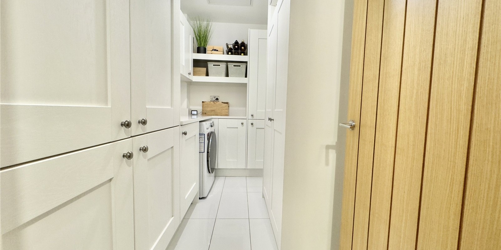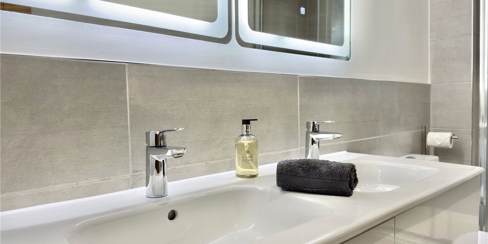 Upon entering the apartment, you’re welcomed by a spacious hallway enhanced by ambient automatic floor lighting and a secure video entry system. The heart of the home is the beautifully designed open-plan kitchen, living and dining area, which opens directly onto a private balcony with views across the immaculate communal gardens. The kitchen itself features a sleek and contemporary finish, including a Proboil instant hot water tap, integrated Bosch appliances such as a dishwasher, hob, oven, microwave and plate warmer, as well as LED under-cabinet lighting. A separate utility room provides further storage and plumbing for a washing machine, helping to keep the main living space clutter-free.