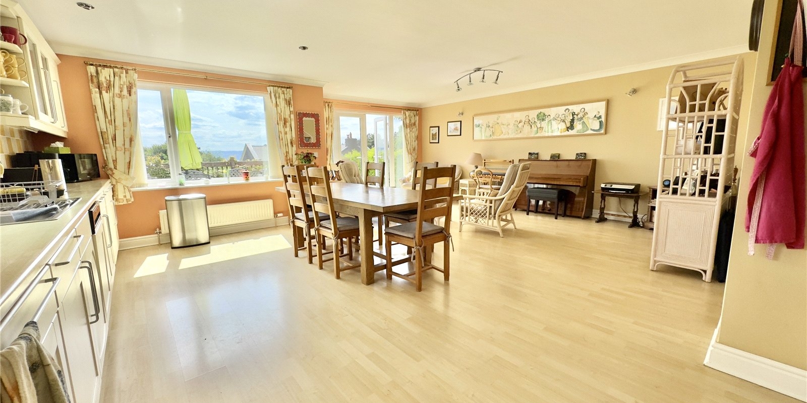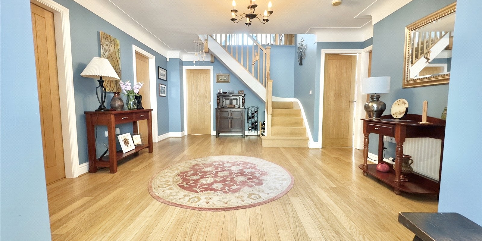 The home enjoys panoramic views across the Dee Estuary and out towards the Welsh Hills, providing a striking backdrop to everyday life. Inside, the ground floor features a spacious and welcoming hallway that provides central access to all the main living areas. There is a stylish bay-fronted dining room, a large and comfortable lounge, and a substantial open-plan kitchen and dining area. The kitchen is well-fitted and includes French doors that open directly onto the landscaped rear garden, creating a seamless flow between indoor and outdoor living. Practical additions include a utility room, a separate boot room, and a convenient ground floor WC.