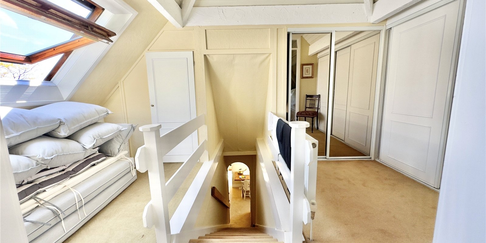 Upstairs are two smaller bedrooms along with several storage cupboards. With a bit of vision, this floor could be transformed into a stunning master suite complete with an en suite bathroom. The home is set on a generous plot featuring a lovely, sunny side garden with lawn and patio areas — perfect for outdoor entertaining or relaxing afternoons. Additional benefits include two separate driveways and a detached garage, offering ample parking and storage.
