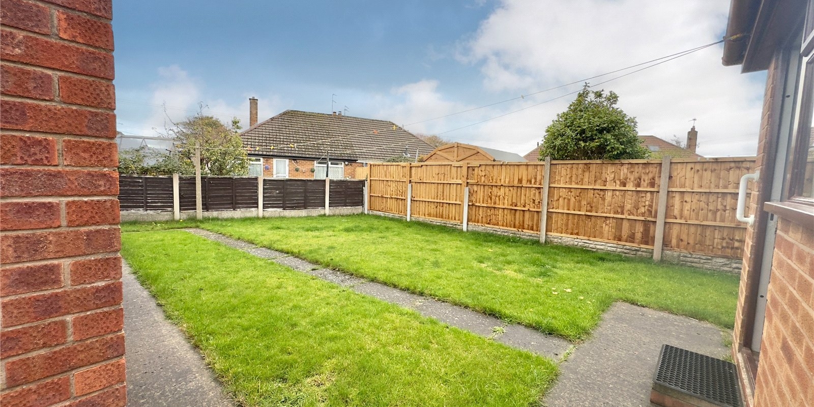 Outside, the property boasts a neat front lawn and a private driveway that runs down the side of the bungalow to a large detached garage, offering ample parking and storage. The rear garden is mainly laid to lawn, providing a peaceful outdoor space with plenty of room for further landscaping or entertaining.