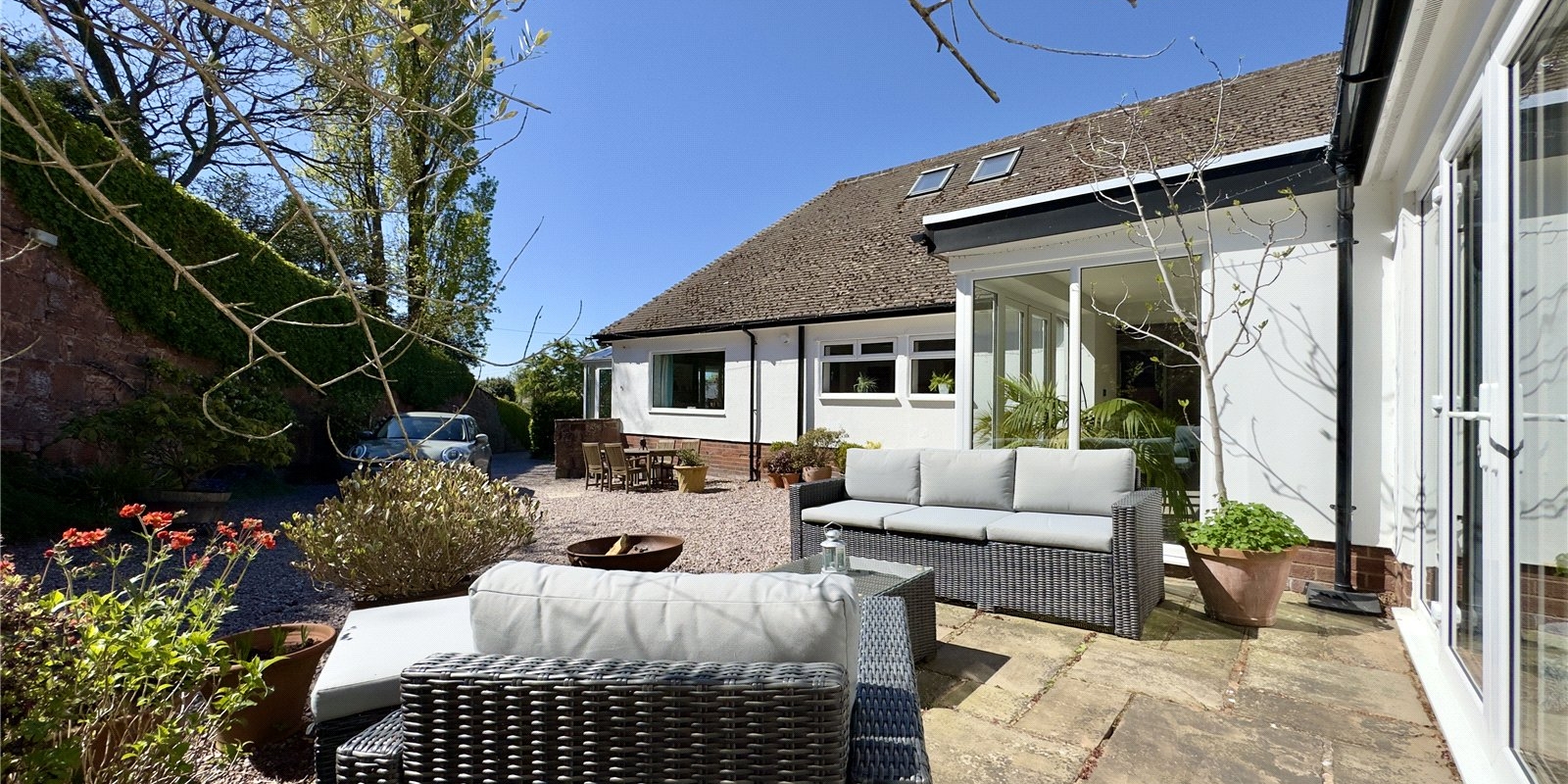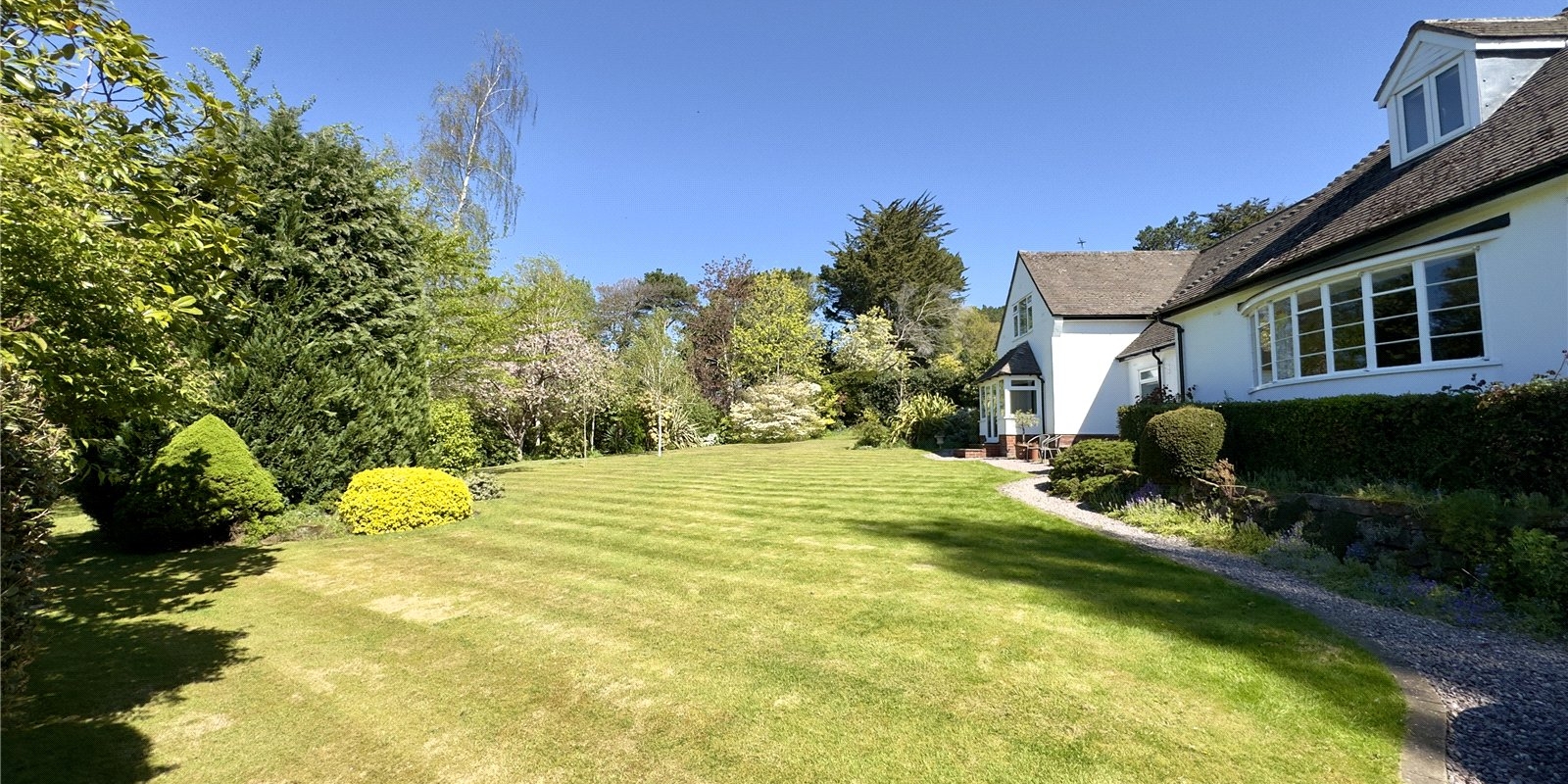 The property sits within beautifully maintained grounds, enclosed by established greenery, sandstone walls, and mature trees. A well-kept lawn wraps around the property, complemented by a flagged patio area ideal for outdoor seating. There is also ample off-road parking.