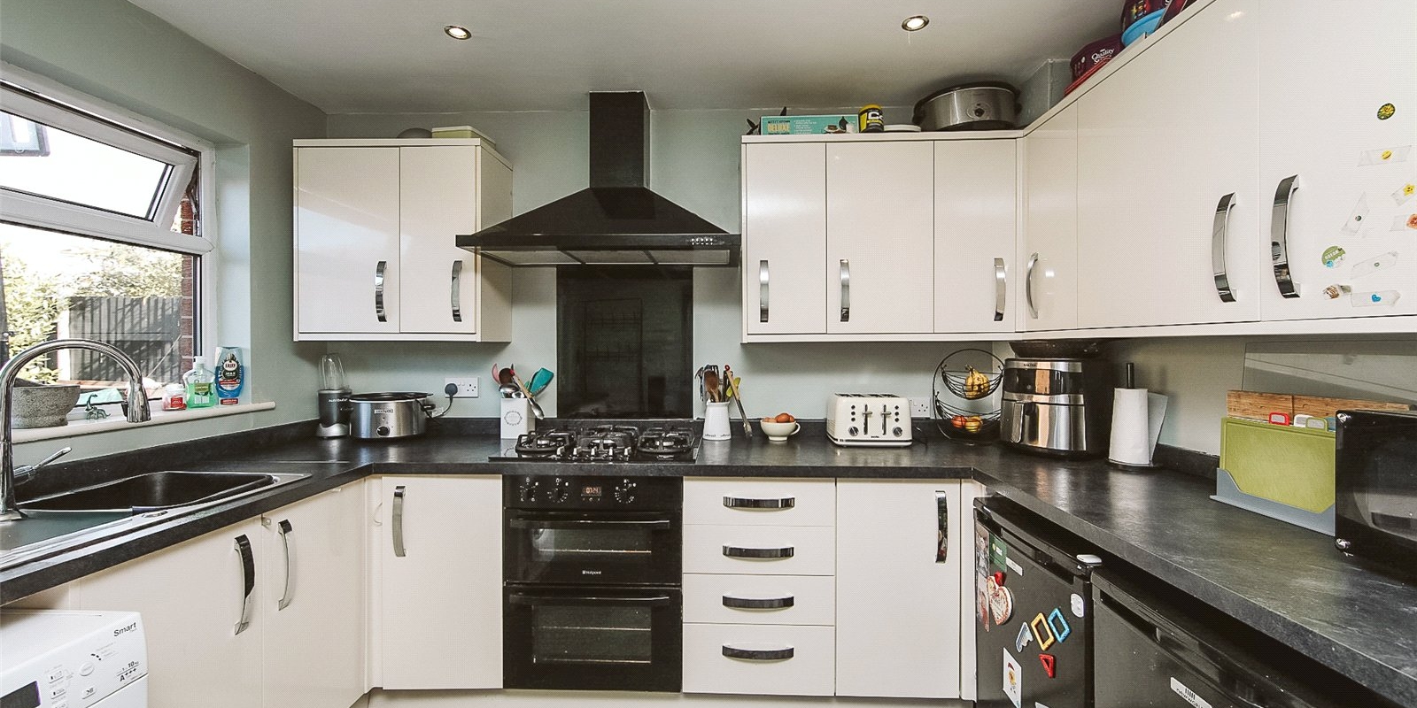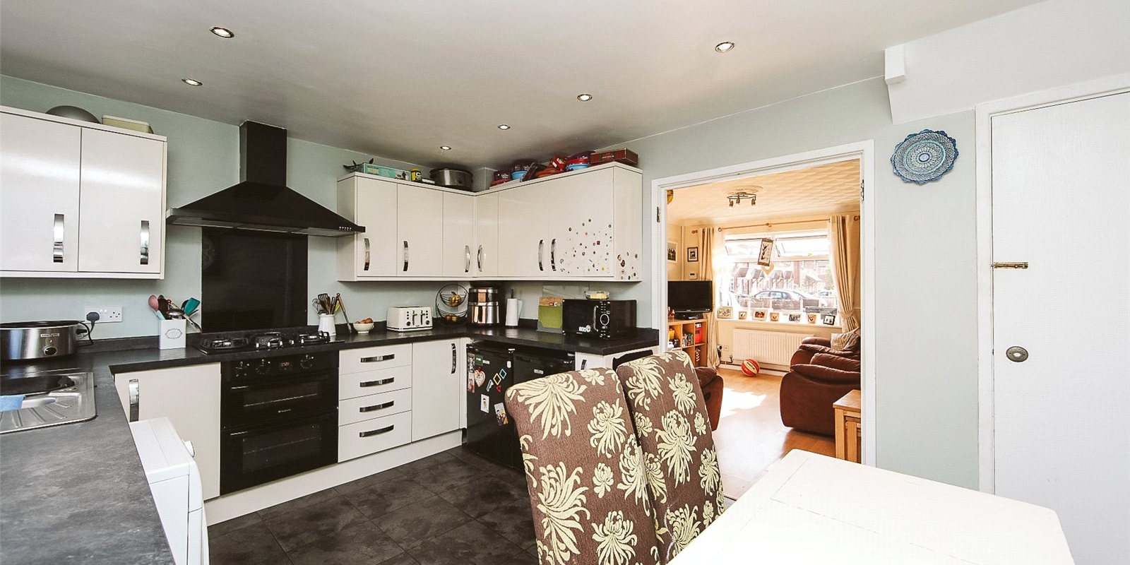 Step inside to find a bright and airy open-plan kitchen-diner with modern fitted units, integrated appliances, and direct access to the rear garden — perfect for summer BBQs or watching children play.