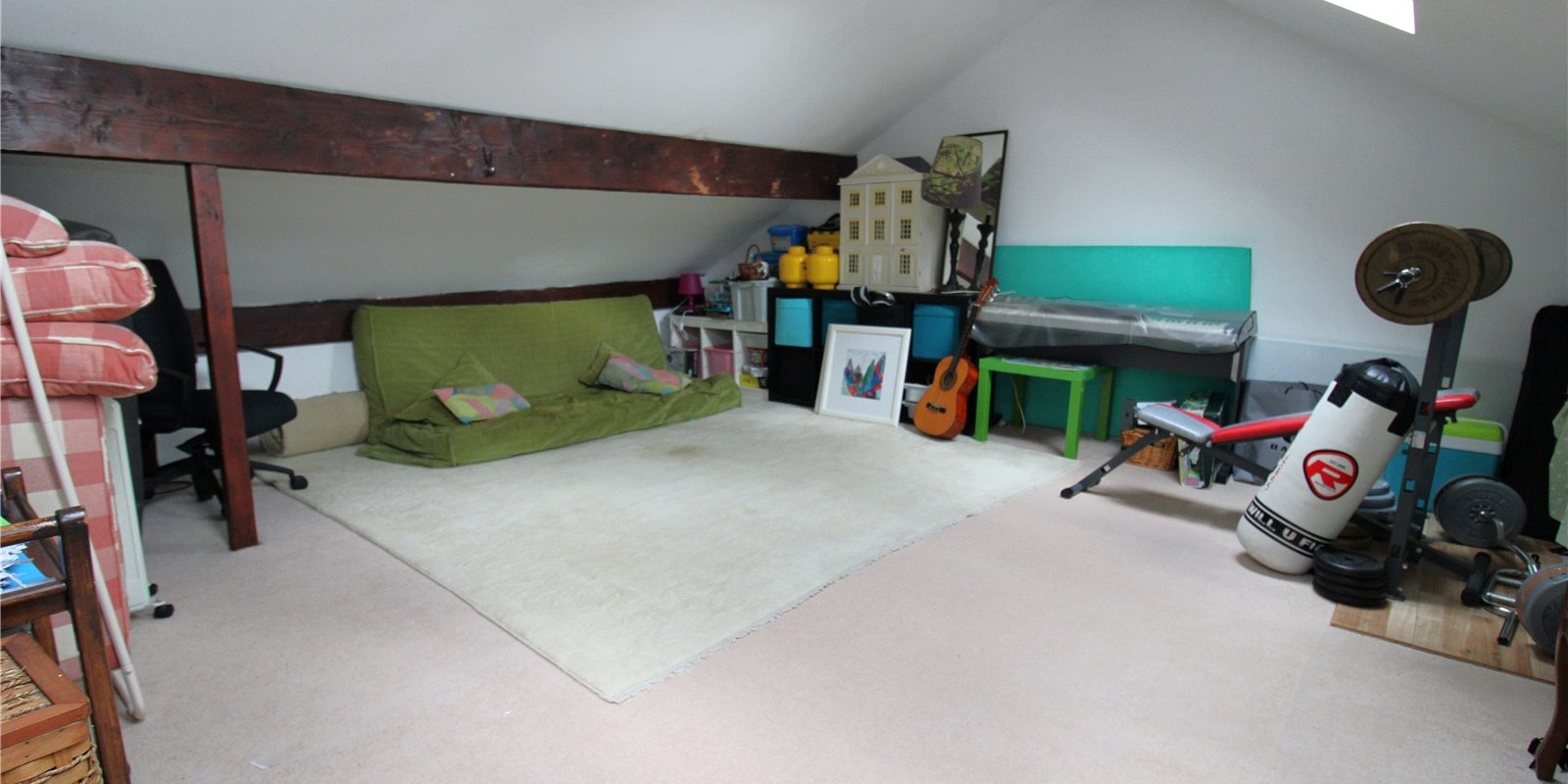 Ascend the stairs to find a modern three-piece family bathroom and four well-proportioned bedrooms, with the primary bedroom enjoying the luxury of yet another delightful bayed window. Further stairs lead to the expansive loft room, offering versatility and ample storage space, illuminated by Velux windows.