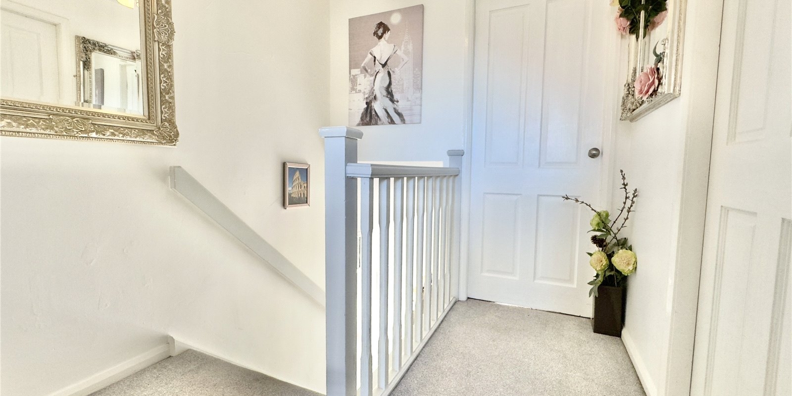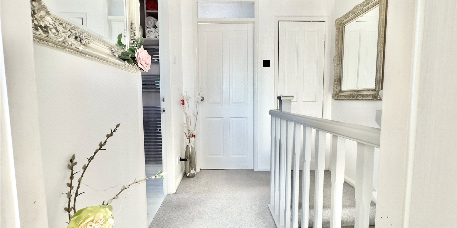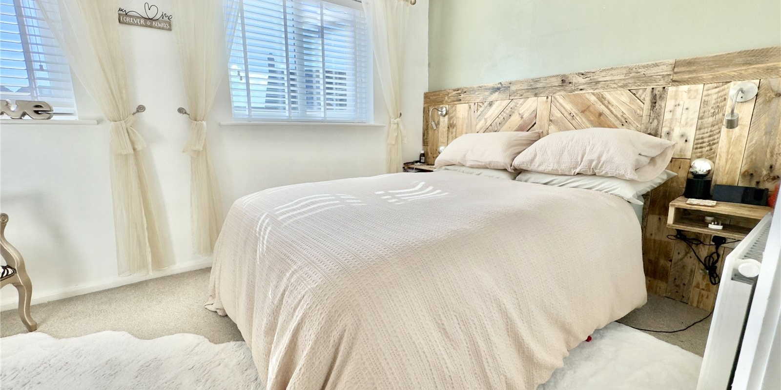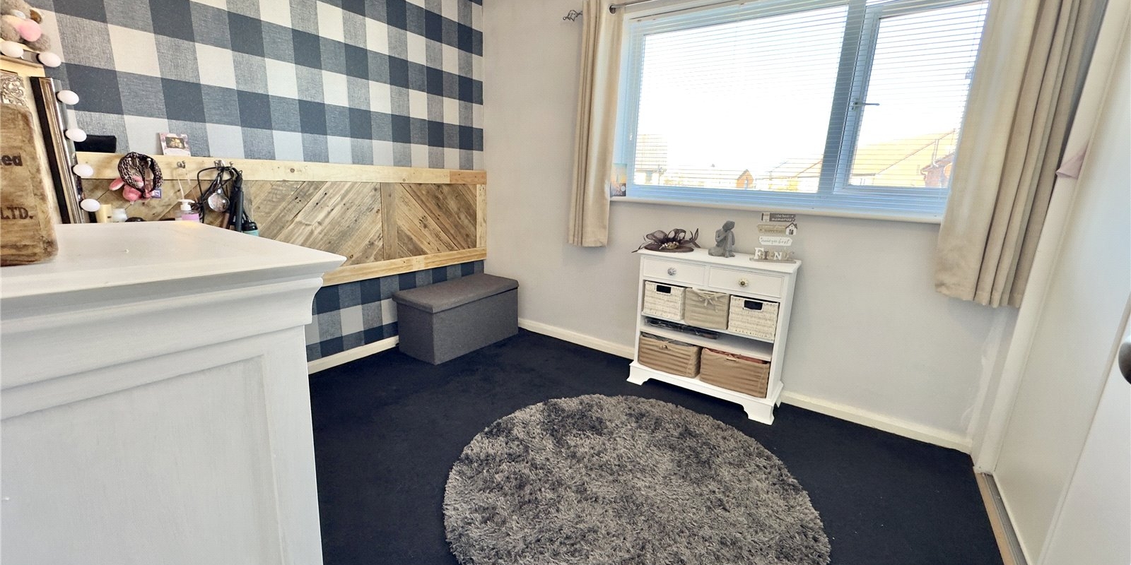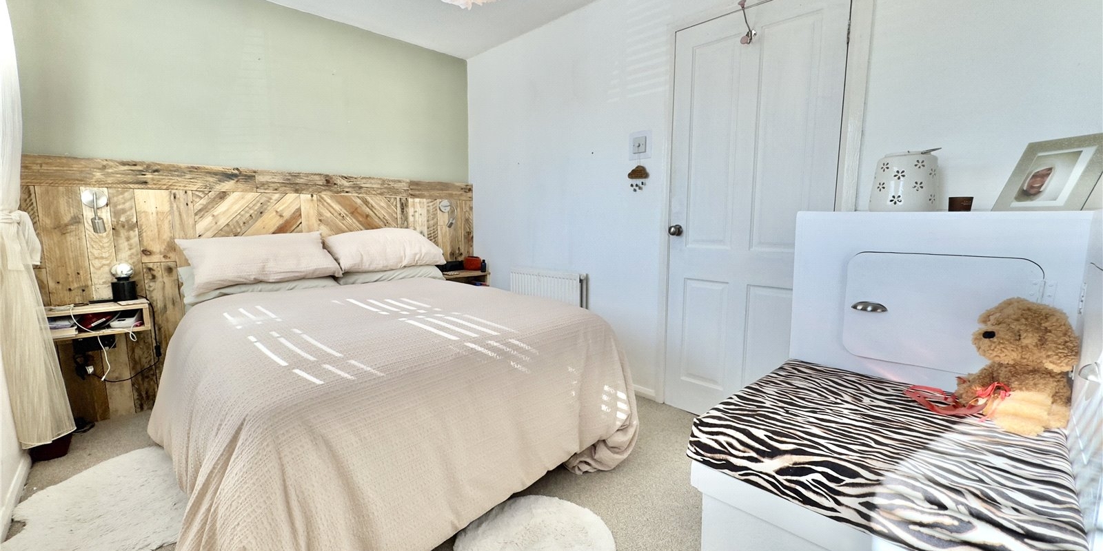 Upstairs, there are two double bedrooms. The master bedroom to the front features a rustic built-in headboard, a charming over-stairs display area, and cleverly designed integrated storage. The second bedroom, located at the rear, also includes a rustic-style headboard, a large built-in wardrobe, a dressing table, and vanity unit providing additional storage. The landing offers a useful storage cupboard, and the modern family bathroom completes the accommodation.