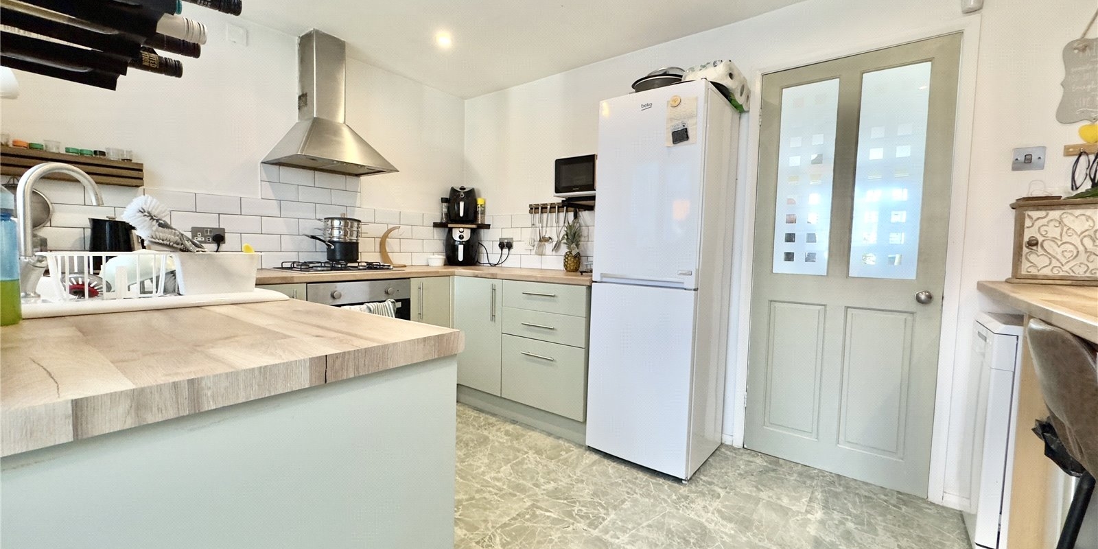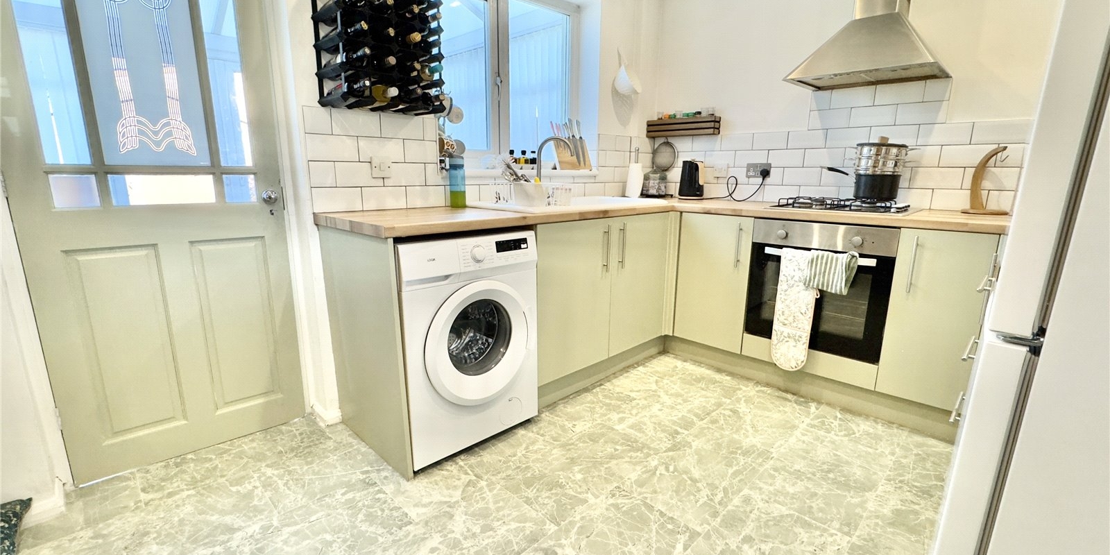 The entrance hall leads to a staircase rising to the first floor and provides access to a bright and spacious living room. Tastefully decorated in a modern style, the living room benefits from a large front-facing window that allows plenty of natural light to flood the space. From here, you enter a stylish and well-equipped kitchen, complete with ample worktop space, built-in appliances, and a breakfast bar ideal for casual dining. A Brand new boiler has just been fitted for extra convenience. The kitchen opens into a generous conservatory at the rear of the property, offering an additional living area with lovely views over the private rear garden.