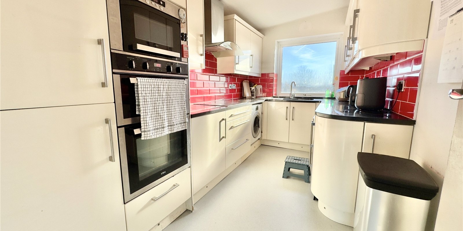 A contemporary fitted kitchen with newly fitting flooring, integrated appliances and a sleek, fully tiled bathroom complete the interior, both designed with practicality and modern style in mind.
