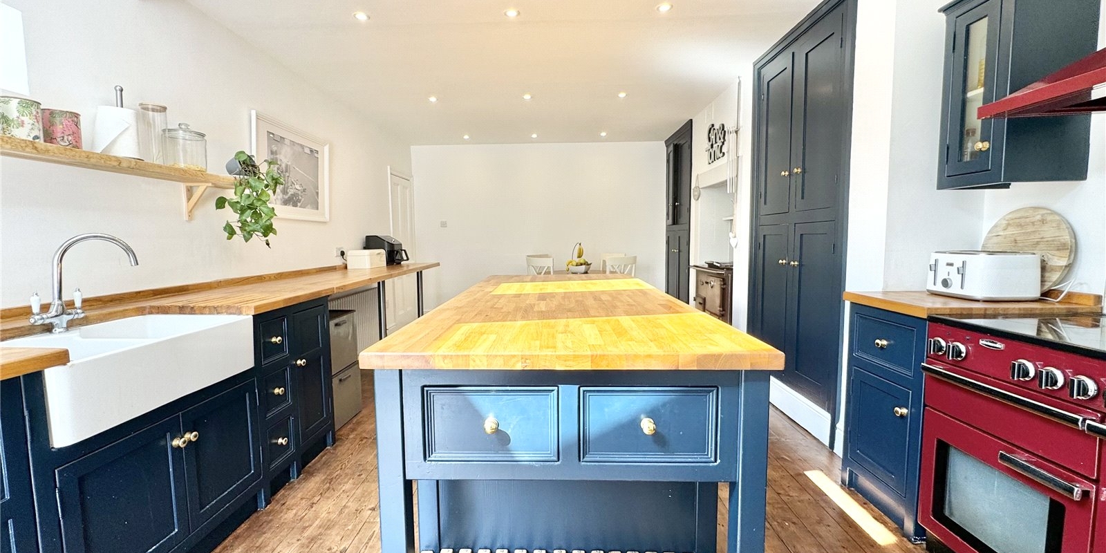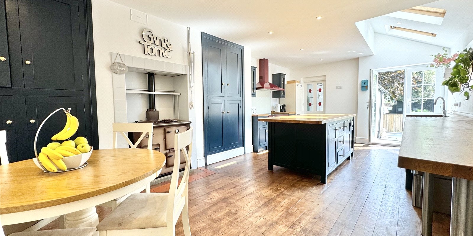 The heart of the home is the beautiful traditional-style kitchen/breakfast room, featuring a charming pitched ceiling, rich navy cabinets, a breakfast island with a solid wood work surface, a range cooker, and an Aga—meaning you can always cater for all the family Christmases—and access to the fantastic entertainment garden through patio doors.