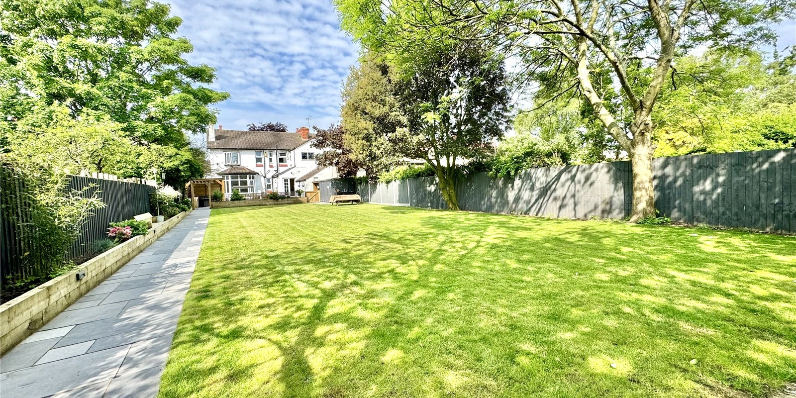 A pathway then stretches the length of the garden, making way for a show-stopper of a garden bar with ample floor space for a full-size snooker table, boasting a custom bar and entertainment area.