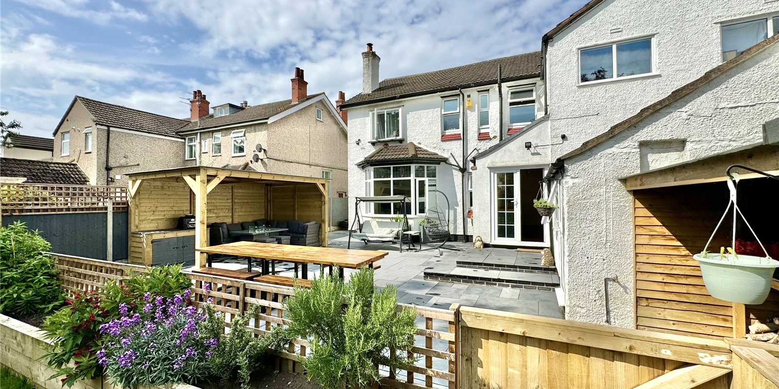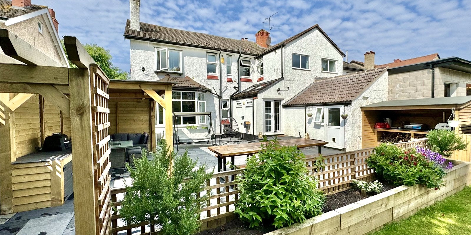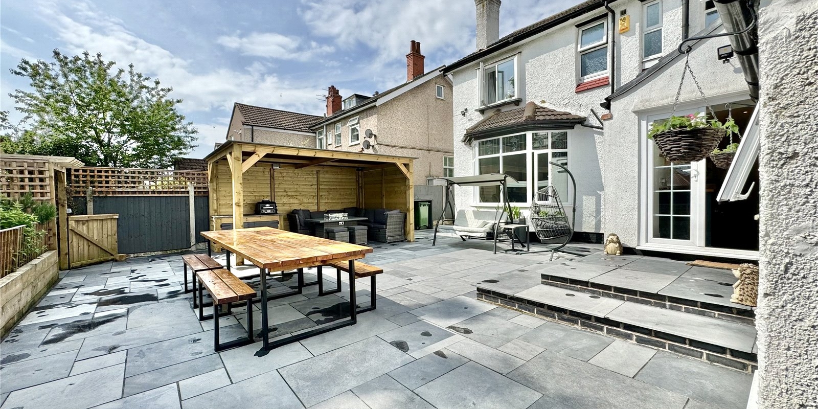The property has been completely transformed by its current owners, featuring a new driveway and a re-landscaped garden with an extensive patio area, complete with canopy spaces ideal for al fresco dining.