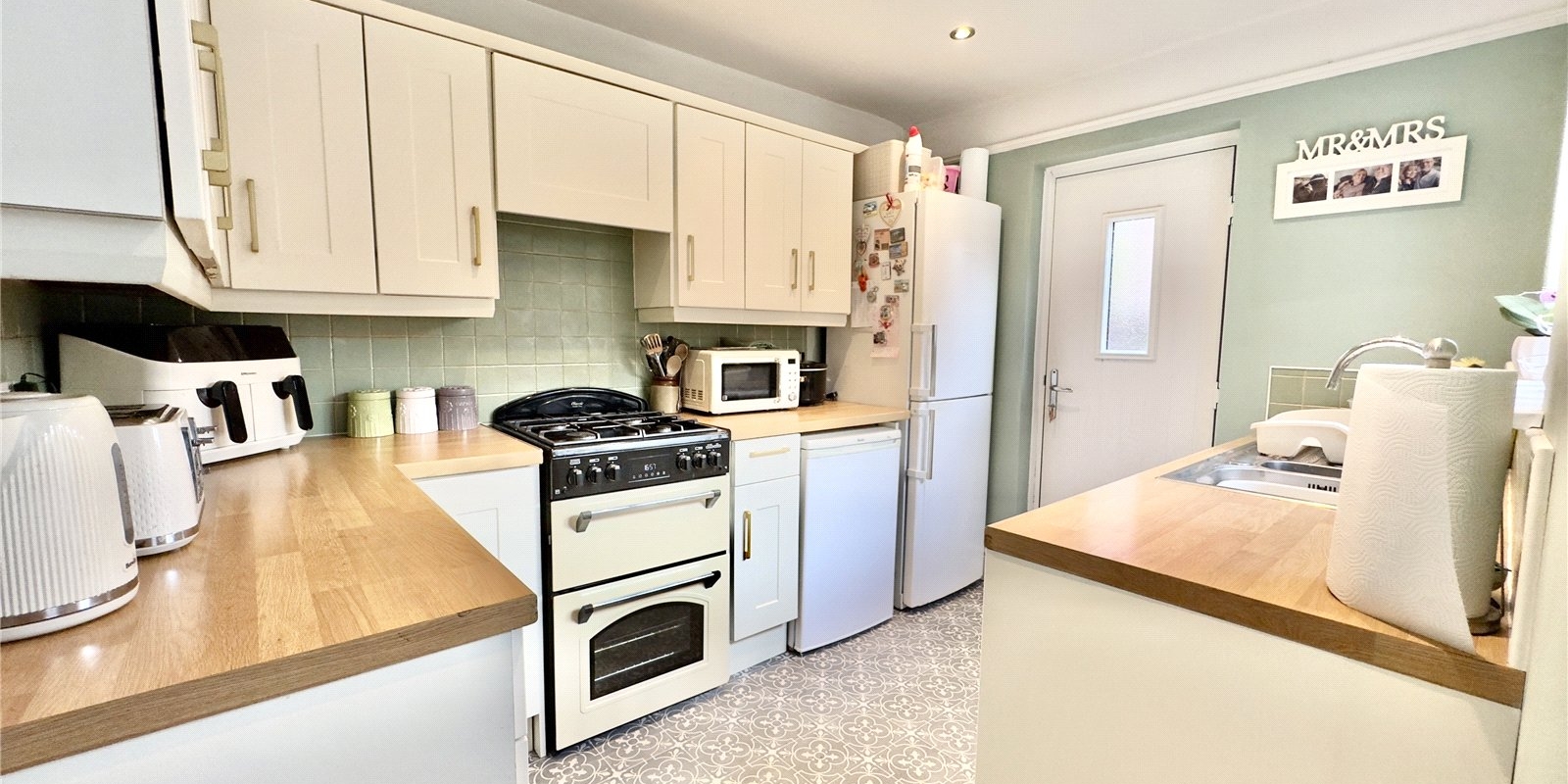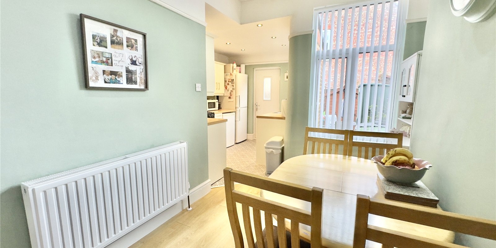 The accommodation begins with a welcoming vestibule that opens into a spacious entrance hall featuring original details and a useful understairs storage area. The front lounge enjoys a large bay window that floods the room with natural light, complemented by a feature fireplace that creates a warm focal point. A second reception room sits to the rear, offering a quiet space ideal as a sitting room, playroom or home office, with patio doors leading directly out to the garden. The dining area opens seamlessly into the kitchen, creating a sociable and practical layout perfect for family meals or hosting guests. The kitchen itself is well-equipped with a range of wall and base units, ample work surfaces and direct access to the rear garden, making indoor-outdoor living effortless throughout the year.
