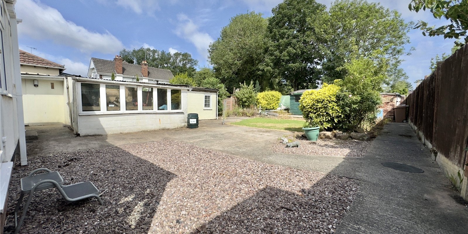 Externally, the rear garden is a standout feature—private and well-sized, it is divided into several distinct areas including a lawn, multiple patios, and a variety of outbuildings. A large workshop is connected to the garage via a covered carport, and several sheds offer additional storage or workspace. Tall, mature trees at the back of the garden provide privacy and a peaceful, secluded feel, creating an ideal outdoor retreat.
