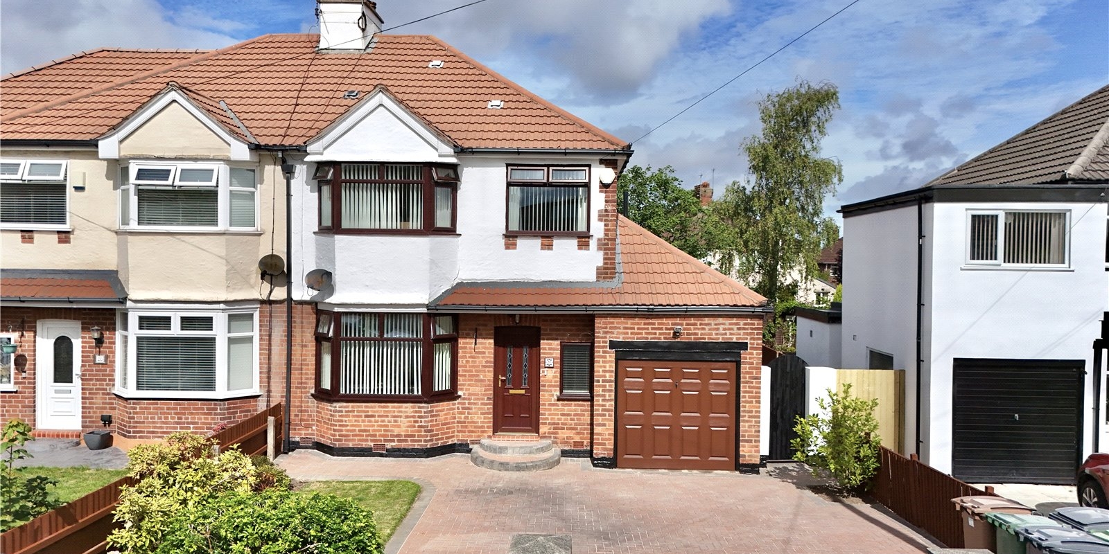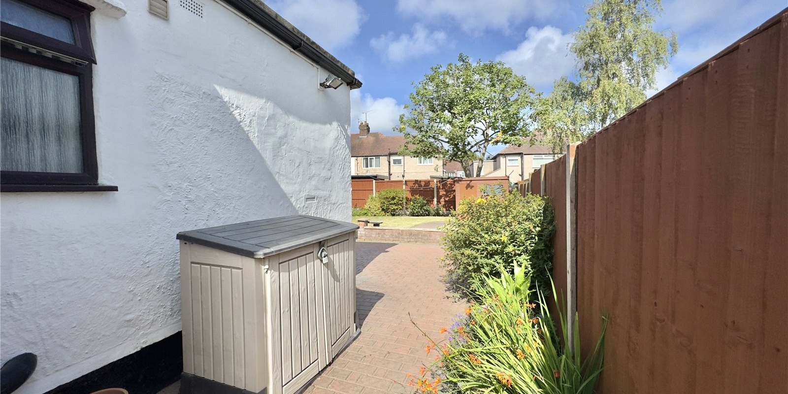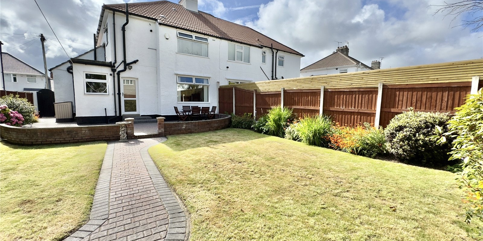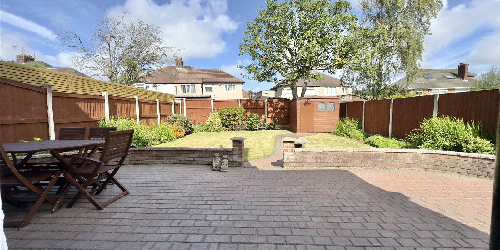 Outside, the property features a generous block-paved driveway with parking for multiple vehicles and access to the garage. The front garden includes a neat lawn with well-stocked borders, while the rear garden offers a peaceful retreat with a block-paved patio, pathway, two lawned areas, mature planting, and full wooden fencing—an ideal space for outdoor dining, play, or simply relaxing in the sunshine.