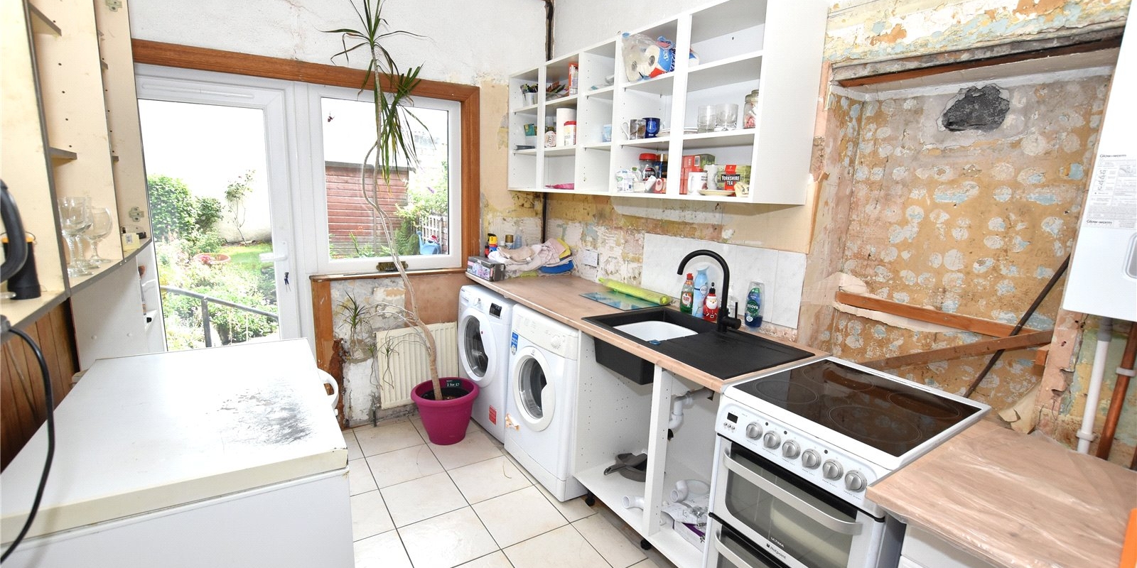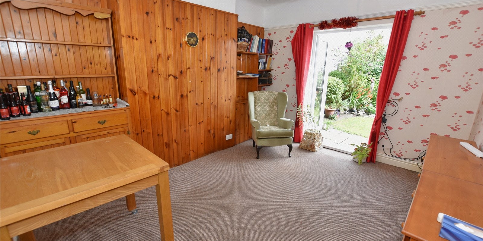 The entrance hall is generously sized and features a folding door leading to a useful understairs WC with storage. The front lounge benefits from a large bay window, filling the room with natural light, while the rear dining room enjoys direct access to the garden through patio doors. The kitchen, also at the rear, offers further garden access. Some renovation has been started here, allowing the next owner the perfect opportunity to complete it to their own style and taste.