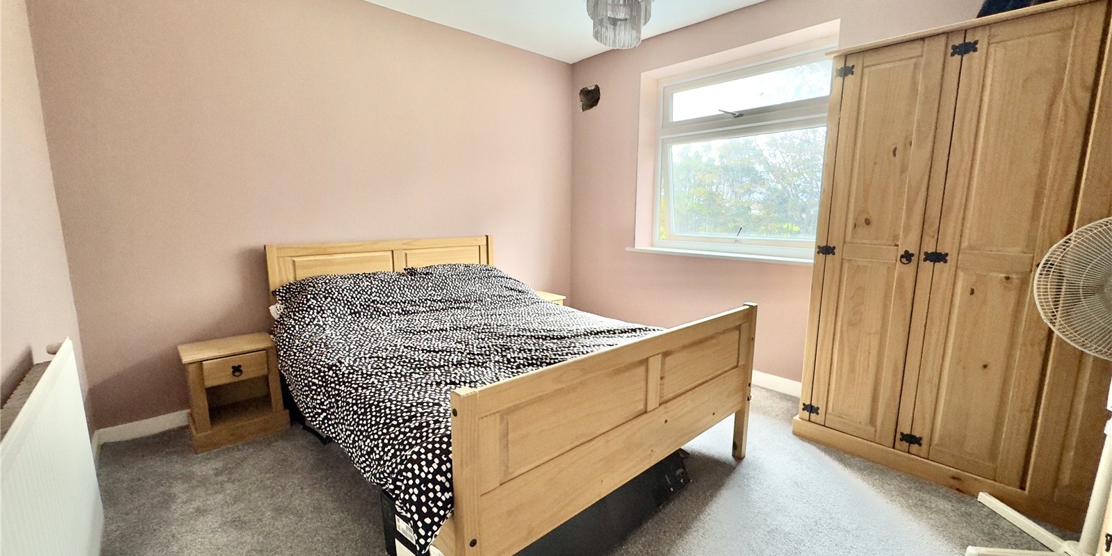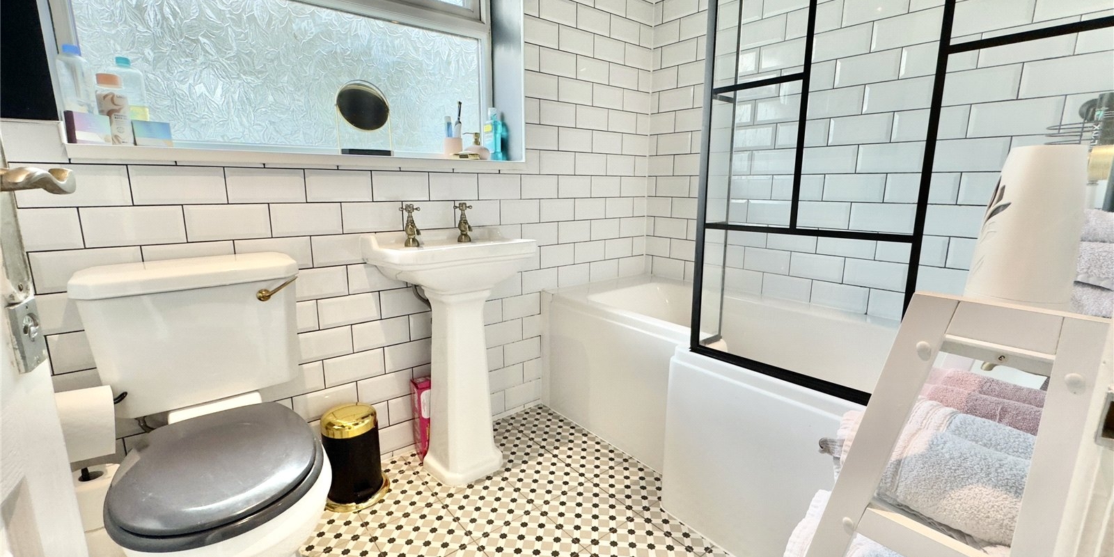Upstairs, there are three generously sized double bedrooms, two of which benefit from built-in wardrobes. The modern family bathroom is finished with a sleek three-piece suite, part-tiled white walls, mosaic flooring, and complementary painted surfaces, offering a stylish and functional space.