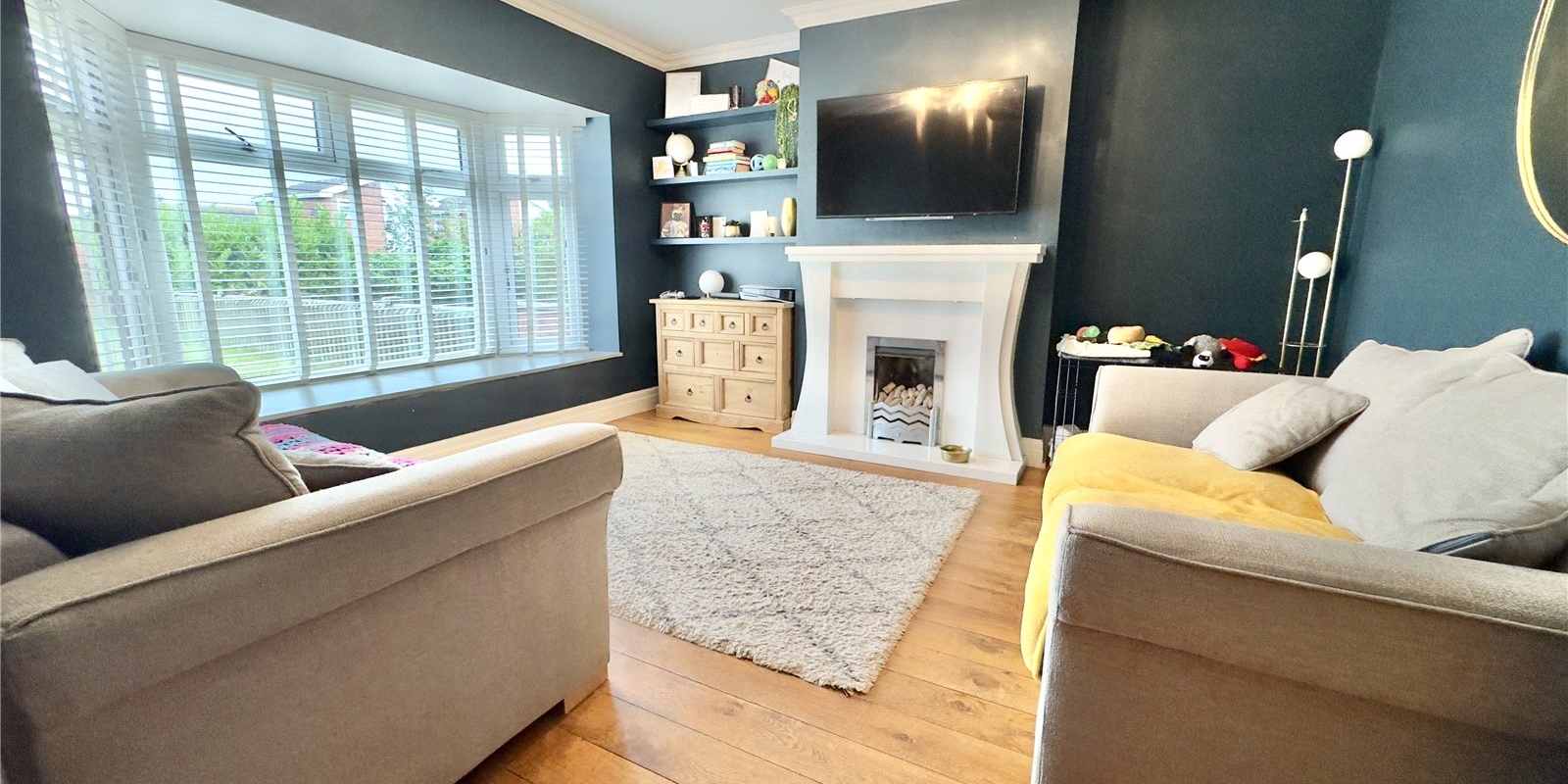 The front living room offers a cosy retreat, again boasting the lovely stained flooring and beautifully enhanced by a large bay window that floods the space with natural light, and a stand out marble fireplace with inset lighting, creating an elegant focal point.