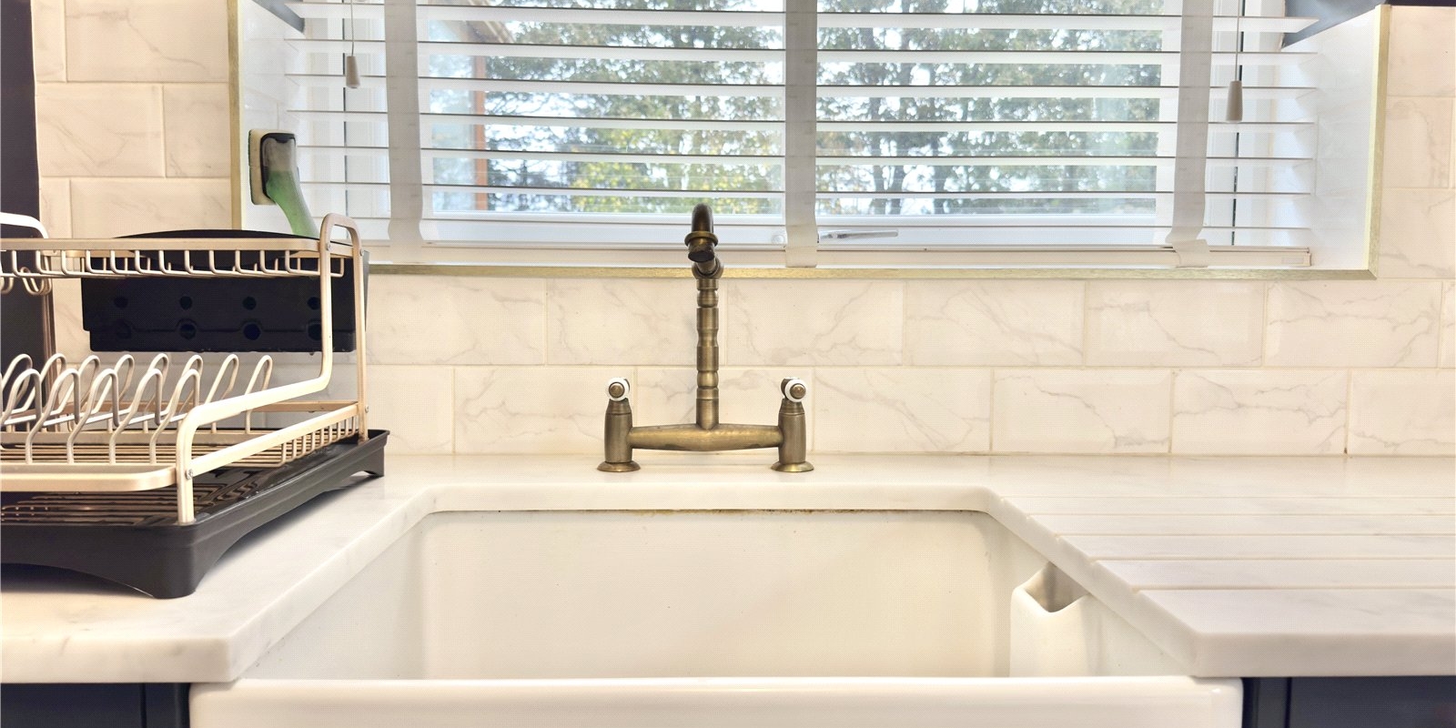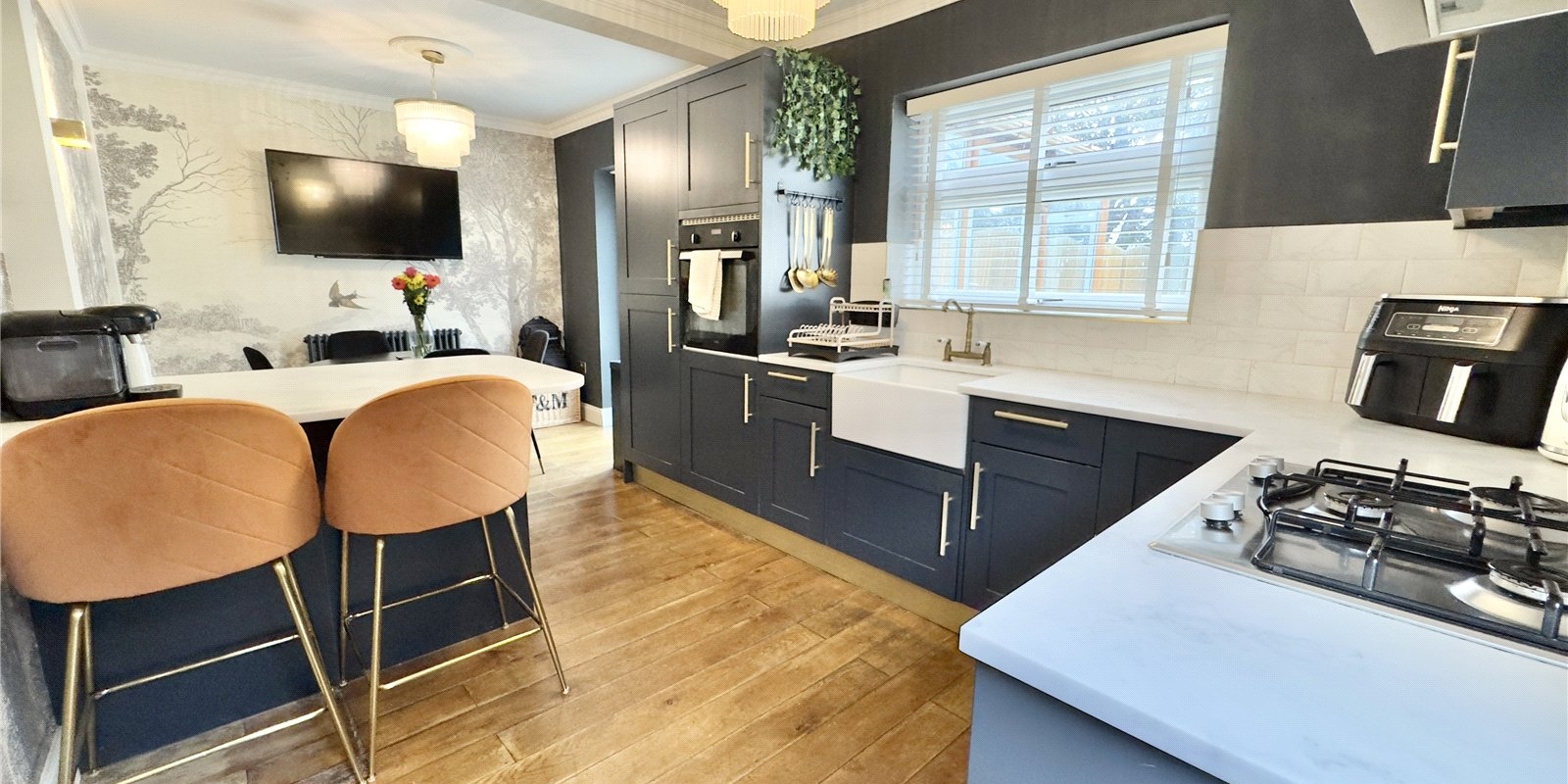 The heart of the home lies in the fully renovated kitchen and dining area, designed with timeless navy cabinetry, brushed gold fittings, white quartz worktops, and white tiled splashbacks. A breakfast bar provides casual dining space, while the open-plan layout flows into a defined dining area with patio doors through to the conservatory—an additional seating area that enjoys lovely views over the rear garden. The kitchen also features a butler sink and integrated appliances for added convenience and style.