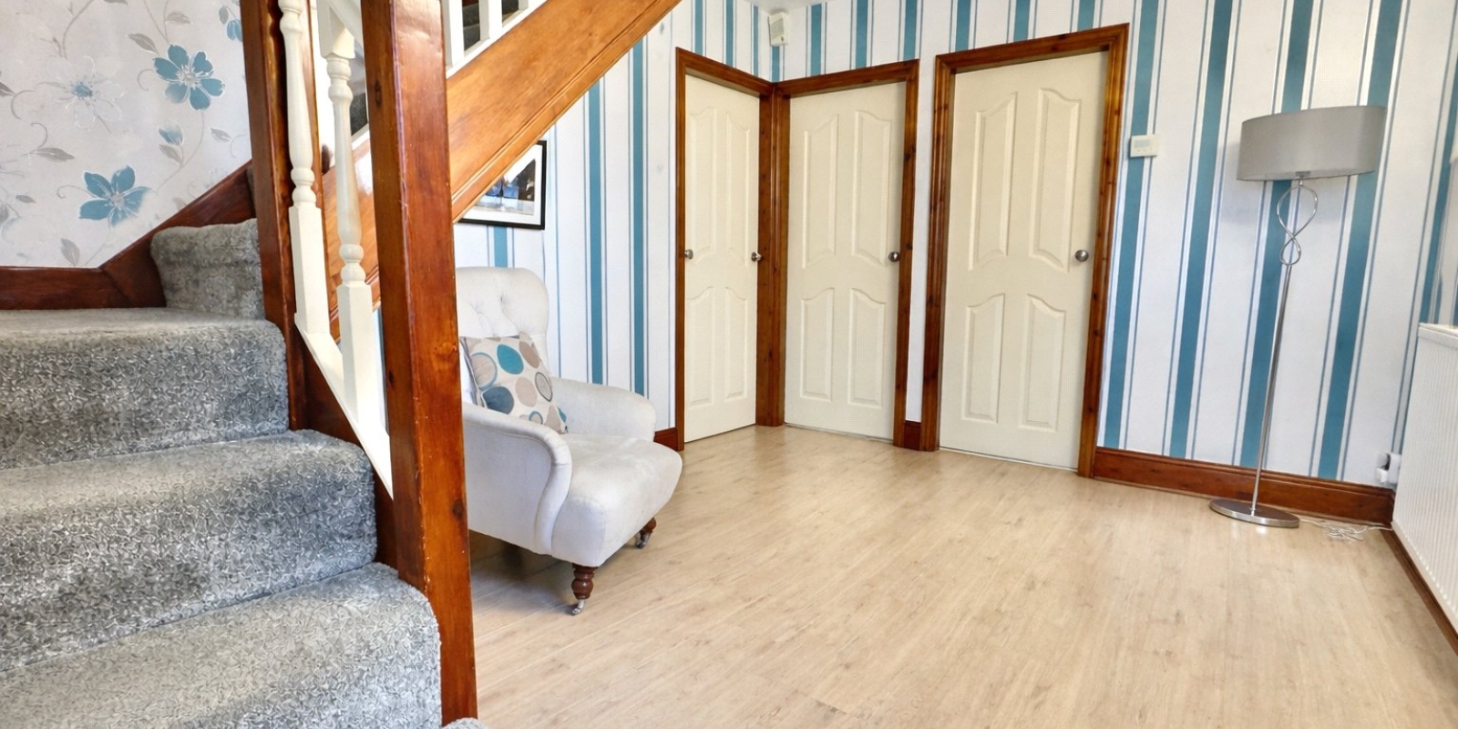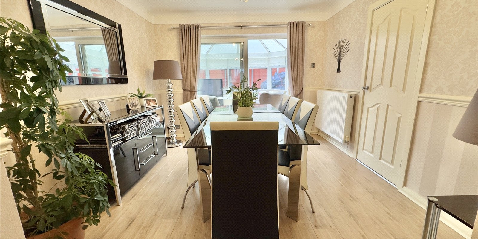 Internally, the ground floor features a large and welcoming entrance hallway, creating a strong sense of space on arrival, along with a convenient downstairs WC. There are two generous reception rooms, including a bright and comfortable sitting room ideal for relaxing and entertaining, opening to a generous dining room perfect for family meals and gatherings.