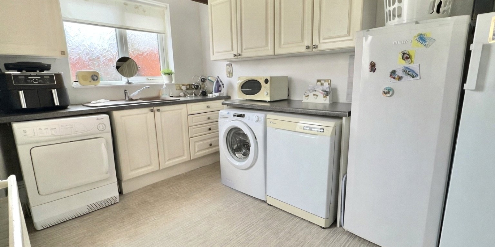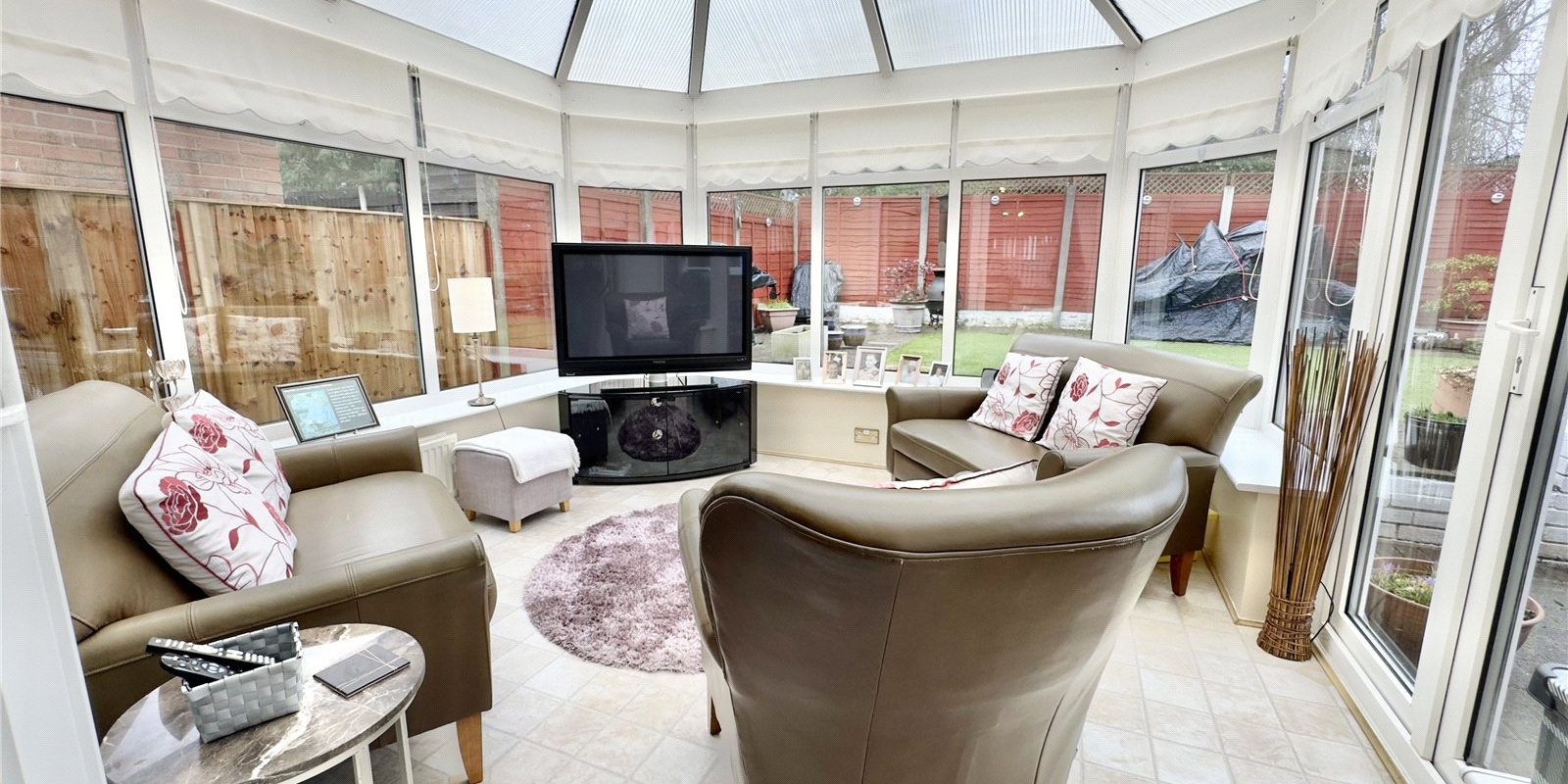 The modern kitchen is beautifully presented, featuring neutral shaker-style cabinetry, ample storage, and generous worktop space, offering both style and practicality. This is complemented by a spacious utility room, providing excellent additional storage and everyday functionality. To the rear, a conservatory enjoys views over the garden and offers a versatile extra living space filled with natural light.