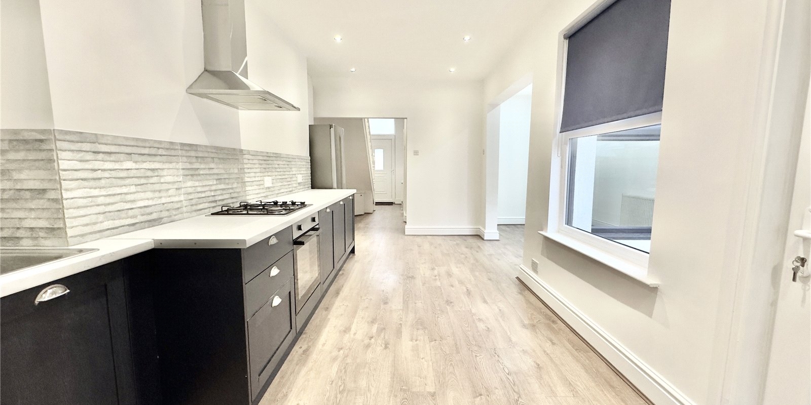 On entering the property you are welcomed into a bright hallway showcasing high ceilings and contemporary décor. The front lounge features a large bay window allowing natural light to flood the room, complemented by a striking navy feature wall. The hallway is open to a stylish fitted kitchen finished with navy cabinetry, contrasting white worktops and a grey splashback. This space opens seamlessly into the dining area, continuing the coordinated colour scheme with another navy feature wall. The open-plan layout is enhanced by multiple windows, creating a light and airy space perfect for both everyday living and entertaining. The rear courtyard is accessed directly from the kitchen.