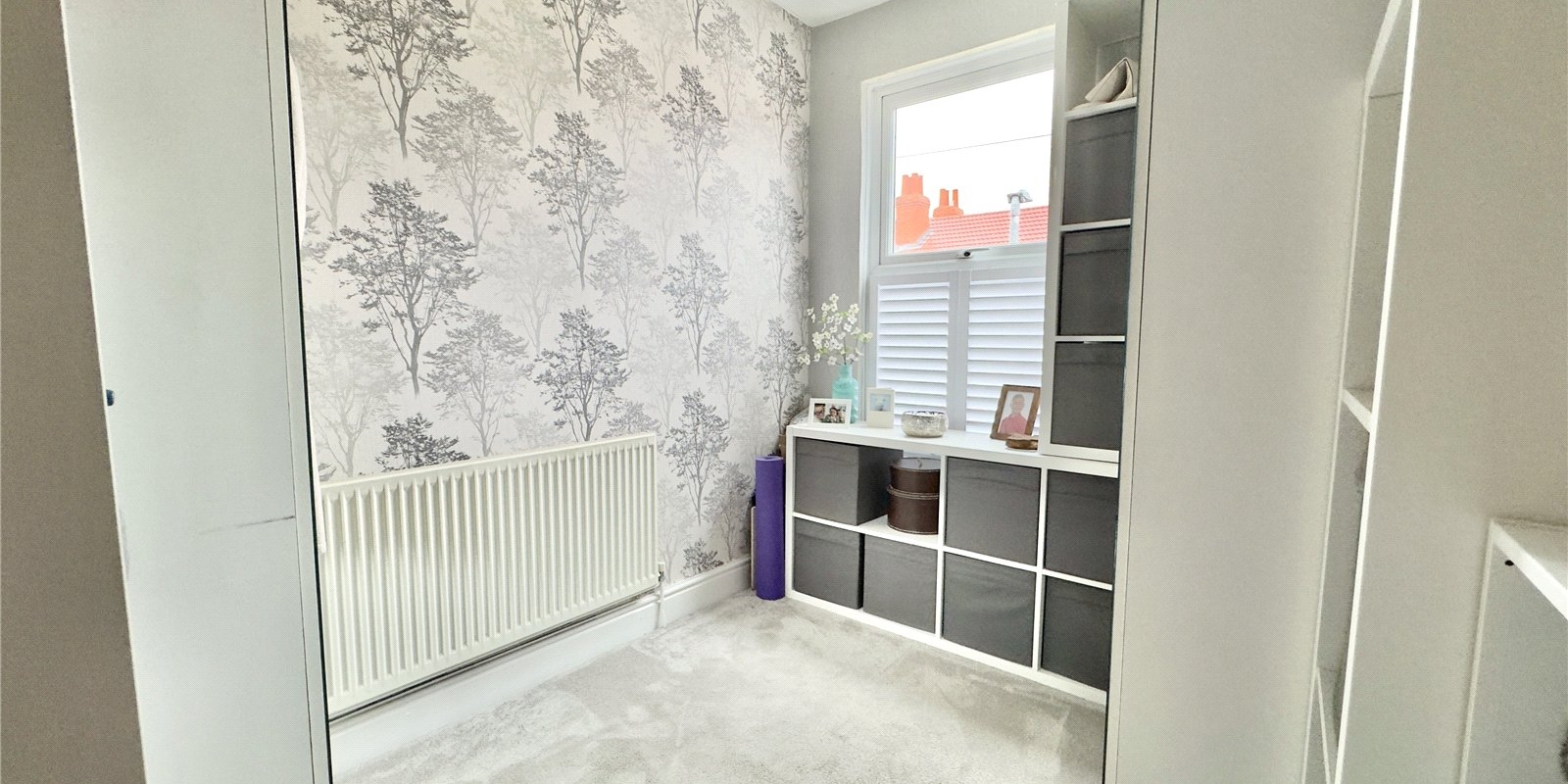 To the front of the property, the welcoming reception room features a beautiful bay window fitted with bespoke upvc blinds, a feature fireplace with a modern electric fire, plush carpeting and rich teal walls complemented by tasteful wallpaper. This cosy yet stylish room provides the perfect setting for relaxing with family.