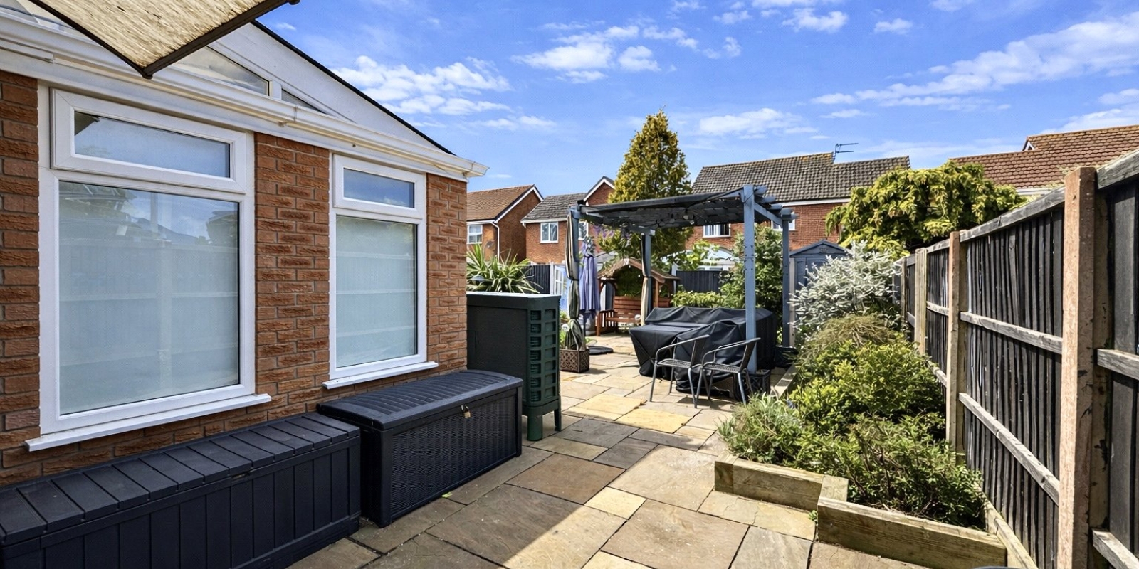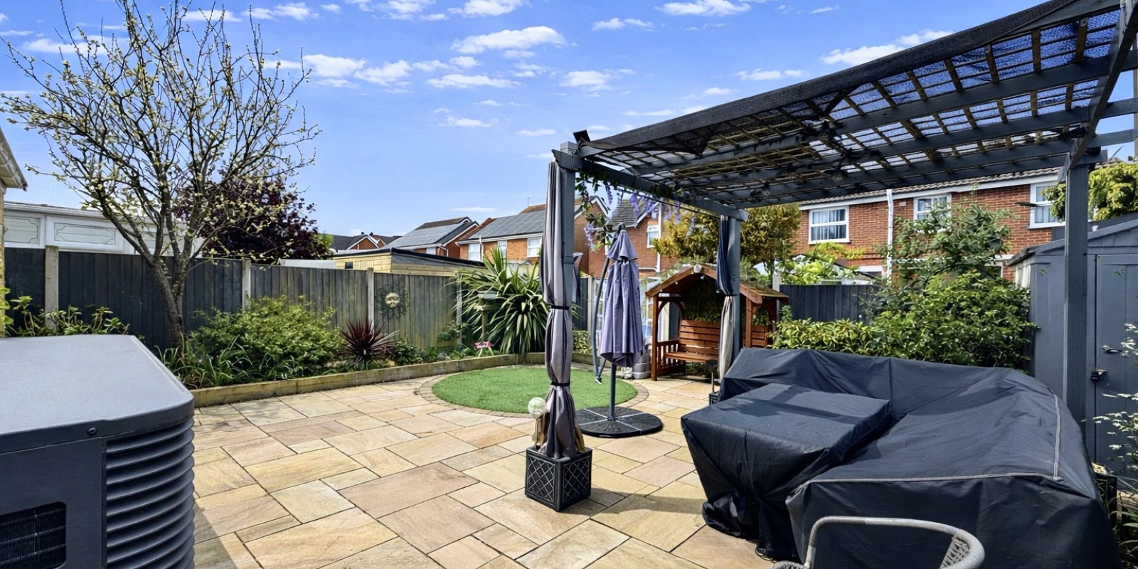 To the rear, the landscaped garden offers a combination of lawn and patio areas, along with a covered seating/pergola space, making it ideal for outdoor dining, entertaining, or simply relaxing in a private and enclosed setting.