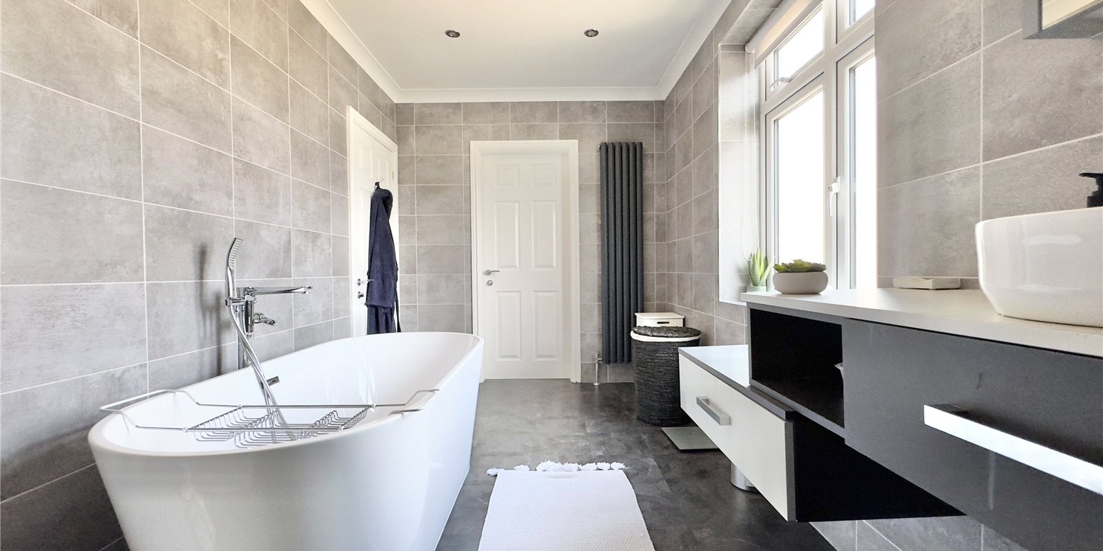 To the first floor, three double-bedrooms, two connected by a "Jack & Jill" en-suite, and a family bathroom which is also connected to the master bedroom. The family bathroom is finished to a beautiful standard, with free-standing bath, and a walk-in waterfall shower.